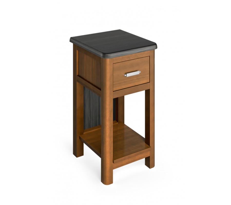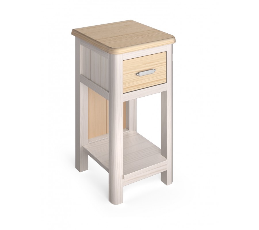 Stolek má čtvercovou vrchní desku, která mírně přečnívá přes zásuvku umístěnou pod ní, což vytváří minimalistický dekorativní efekt. Zásuvku doplňuje jednoduchá horizontální kovová úchytka. Přední svislé hrany stolku, procházející přes linii nožiček jsou výrazně zaoblené, což zjemňuje moderní design, zatímco zadní jsou rovné a umožňují nábytek stabilně přisunout ke zdi. Ve spodní části je umístěna police s plnou zadní stranou, vhodná i pro odkládání větších předmětů.