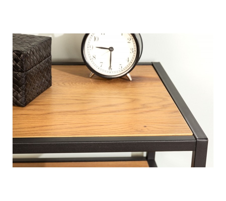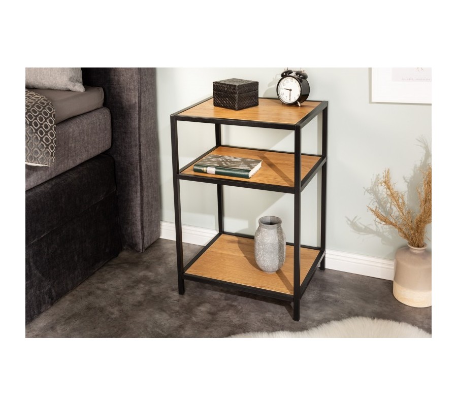 Designový hnědý noční stolek Industria Natura s černou kovovou konstrukcí a dvěma poličkami v provedení dub 63cm