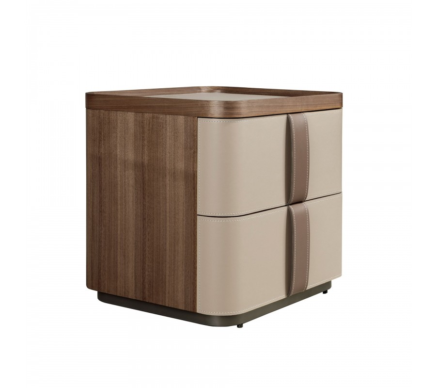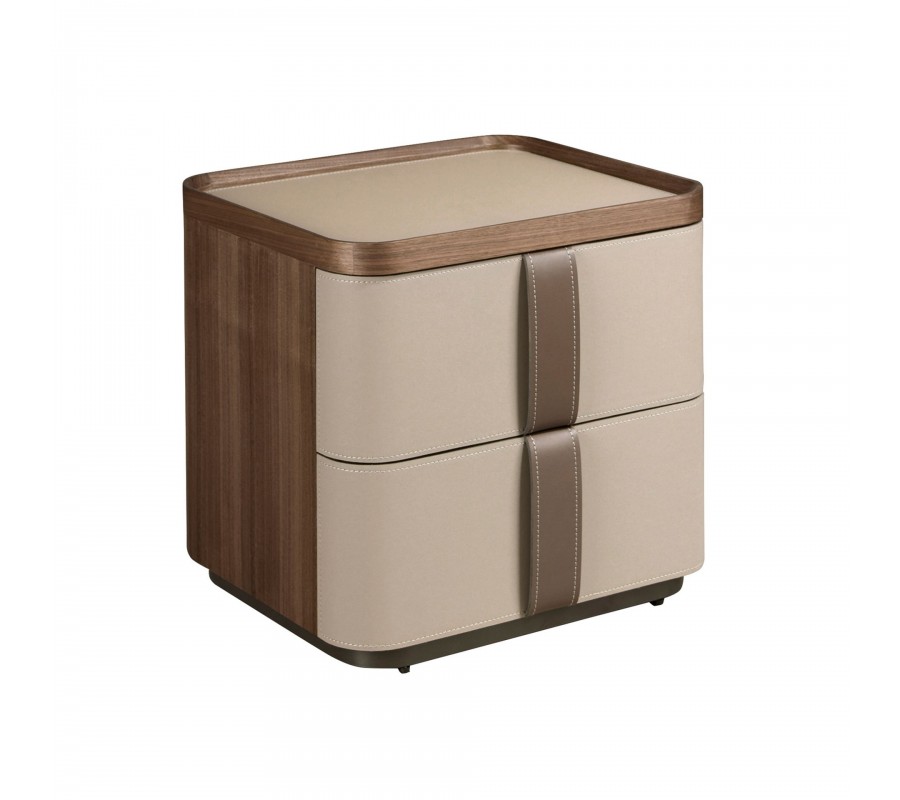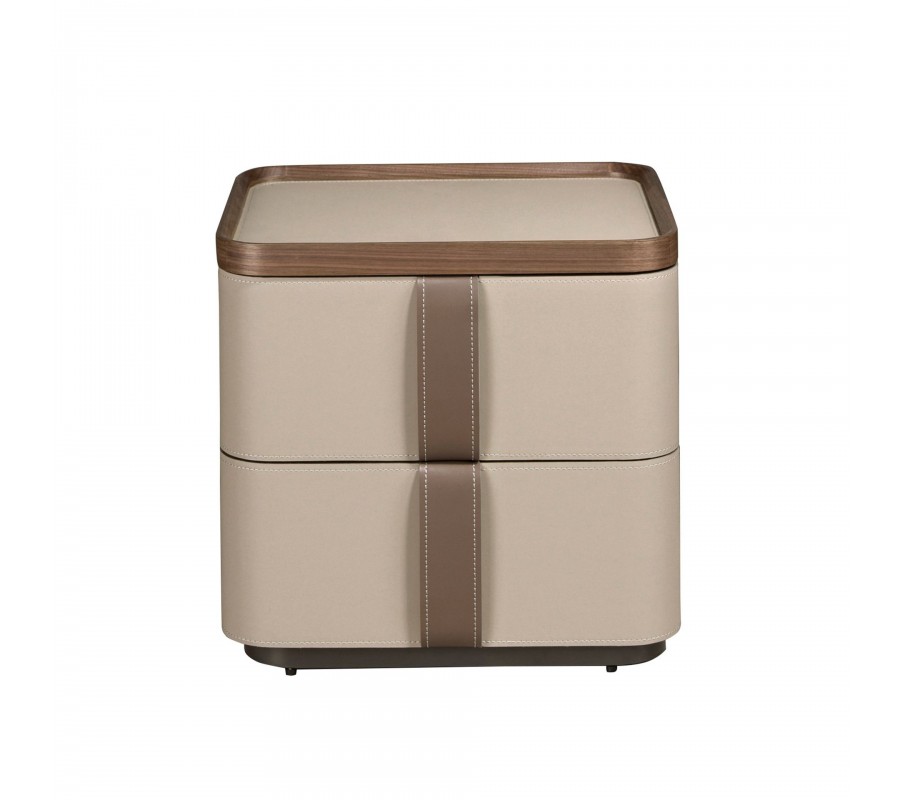 Luxusní moderní noční stolek Charmoin se dvěma šuplíky z ořechově hnědého dřeva s béžovým potahem z pravé kůže 50 cm