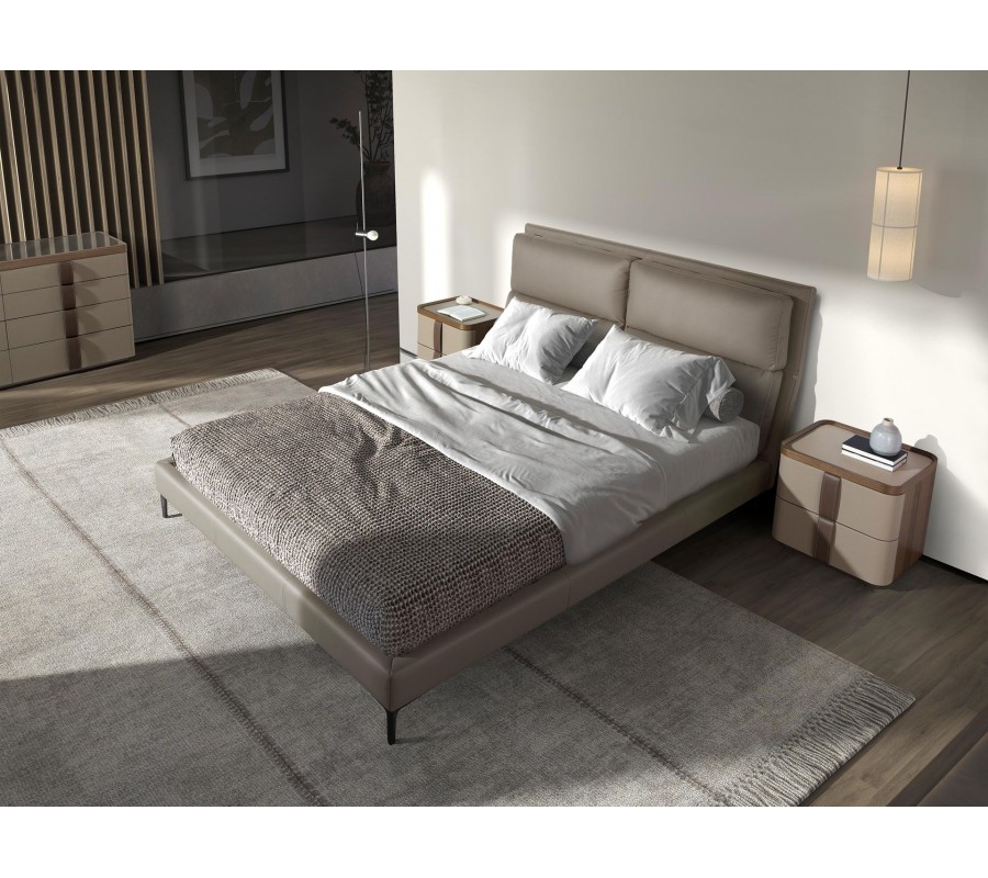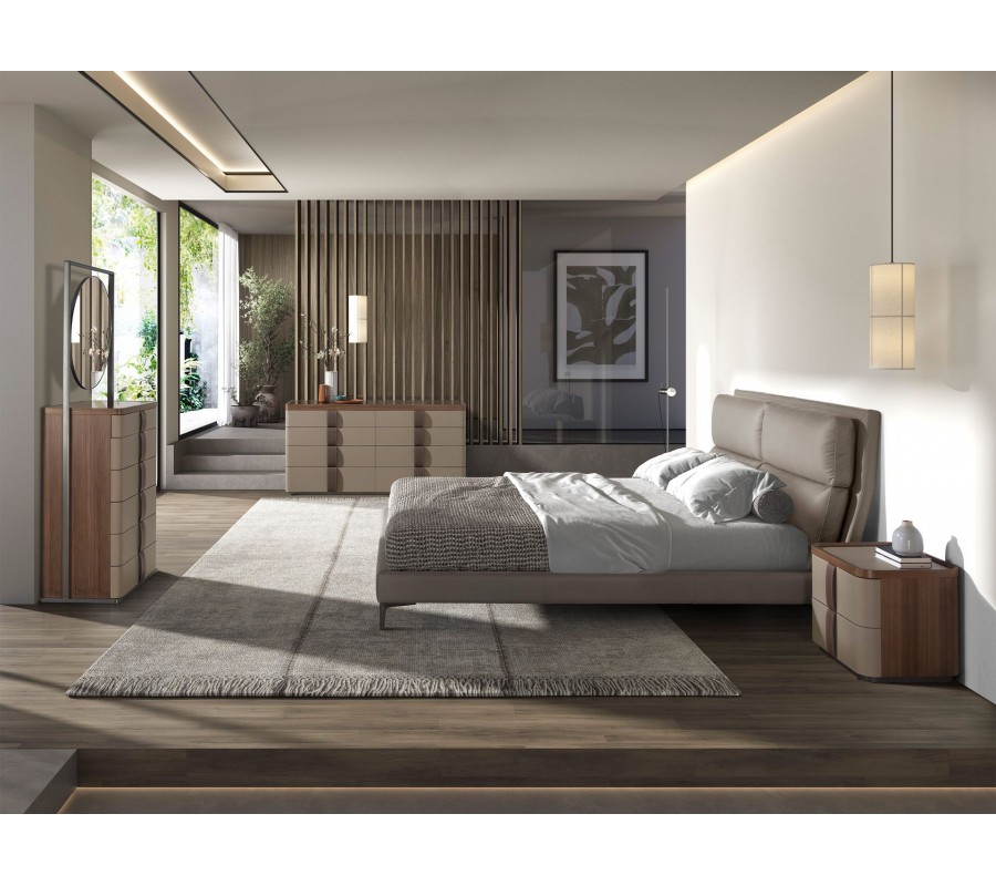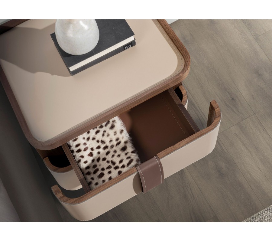 Noční stolek je vyroben z kvalitní ořechové dýhy v naturální teplé hnědé barvě. Viditelná kresba letokruhů podtrhuje naturální vizuál a krásně koresponduje s potahem z pravé kůže v béžové barvě, který překrývá vrchní desky a čela zásuvek. Výrazné úchyty jsou také vyrobeny z kůže, ale v kontrastní čokoládové hnědé barvě. Kromě své praktické funkce poskytují moderní dekorativní element v podobě svislého pásu, procházejícího středem fasády nábytku.