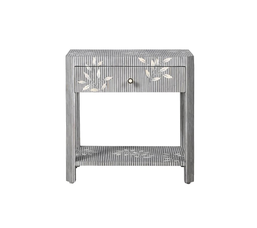 Luxusní vintage noční stolek Liora z mangového dřeva s intarzií bone inlay v šedo-bílé barvě se zásuvkou a policí 62 cm
