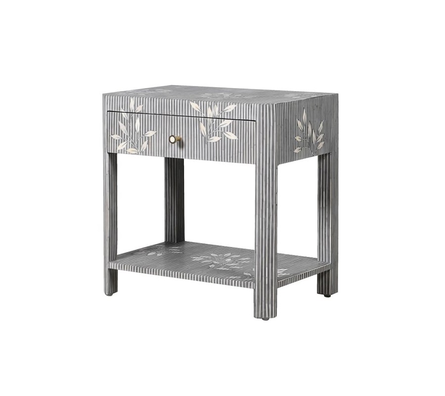 Noční stolek Liora je uměleckým dílem ruční práce, který vyniká propracovanou technikou bone inlay. Každý detail je precizně vytvořený z drobných kousků kosti a mangového dřeva, které se pravidelně střídají a společně vytvářejí jemný rostlinný motiv na kontrastním šedém podkladu. Povrch stolku zdobí vertikální proužky, které dodávají designu hloubku a rytmus, zatímco perleťový lesk intarzie působí jemně a elegantně.