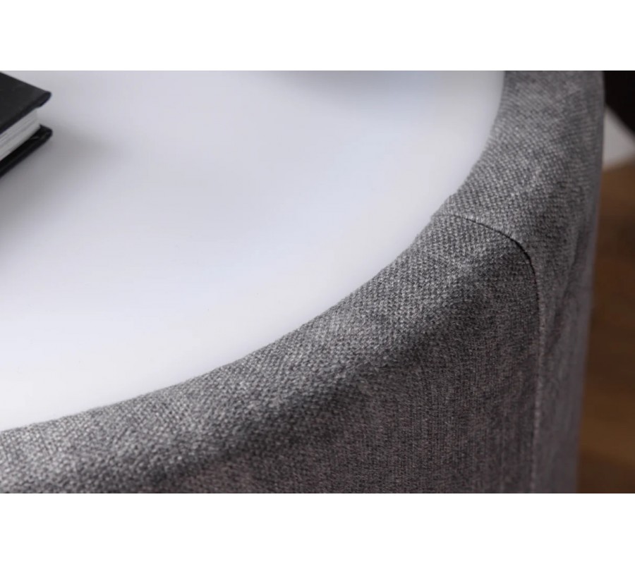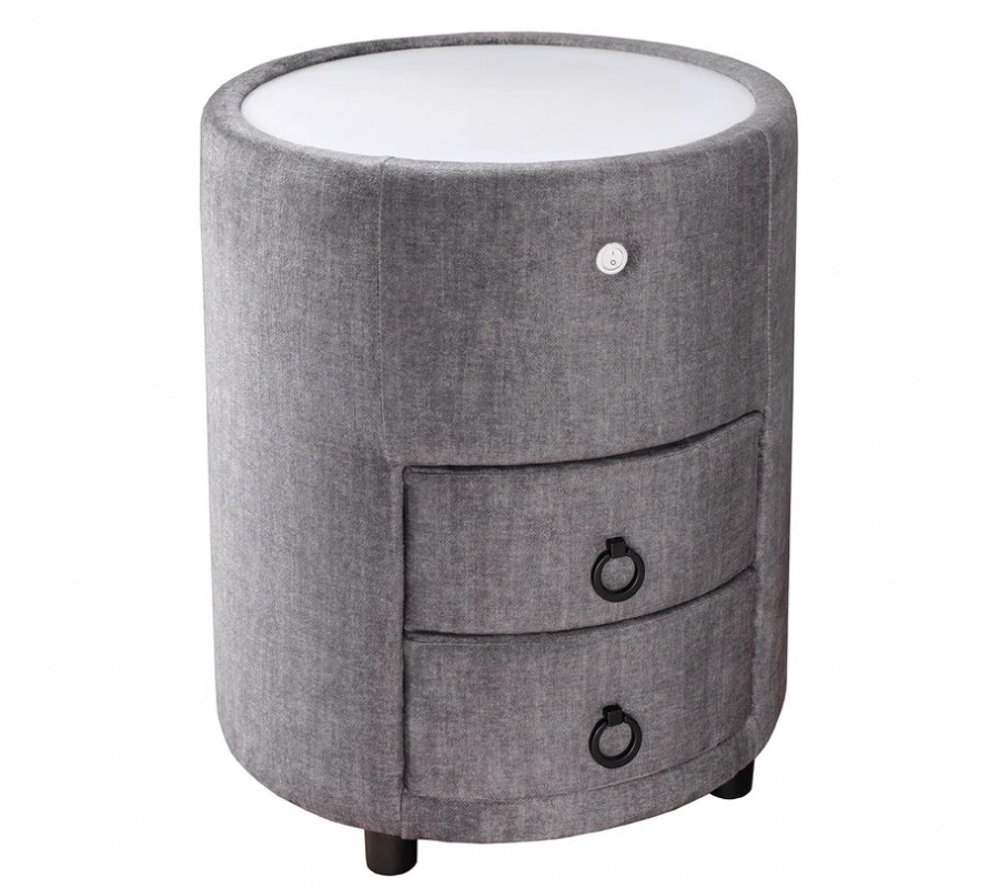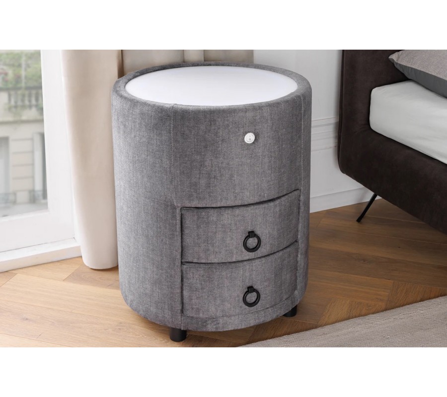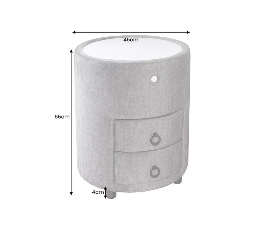 Noční stolek mohutnou siluetu s kulatým půdorysem, která je po obvodu překryta sametovým potahem v šedé barvě. Mikrovlákno mu zaručuje výbornou odolnost a nábytek tak vydrží dlouho krásný. Vrchní deska v bílé barvě má mírně vyvýšené okraje a zabudované LED podsvícení, které se ovládá pomocí kulatého bílého vypínače na přední fasádě stolku.