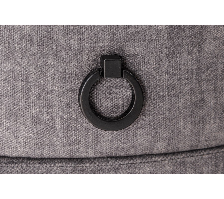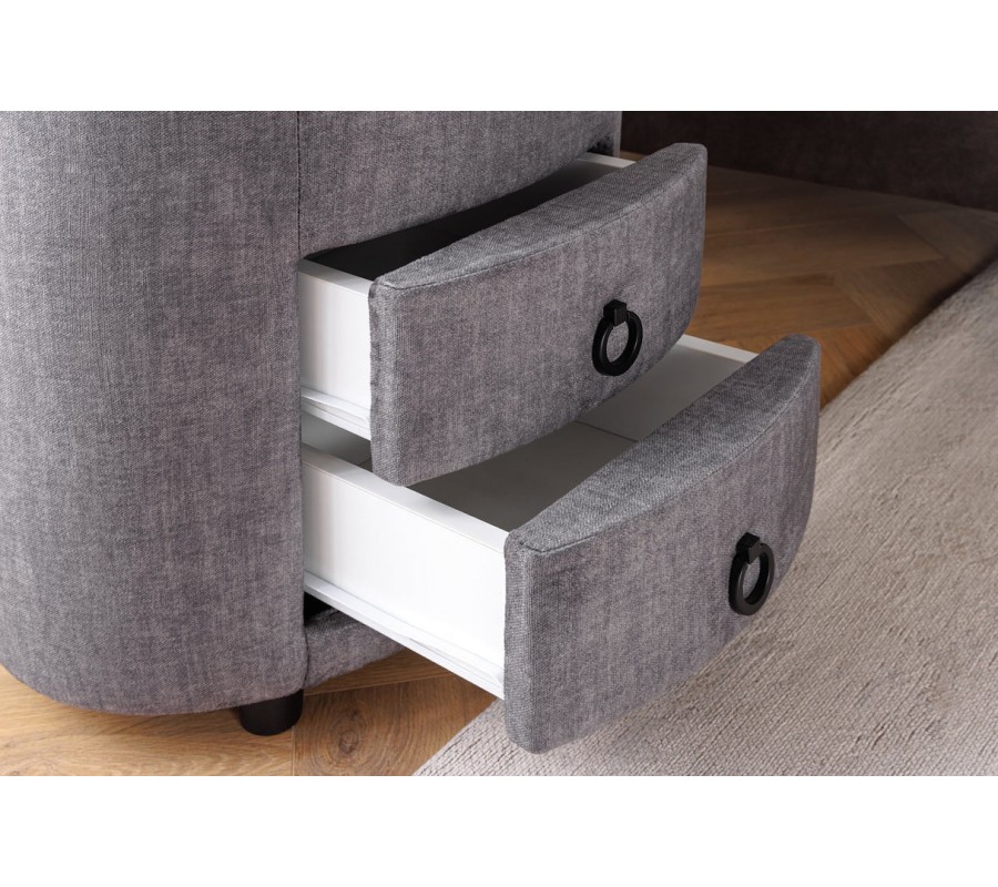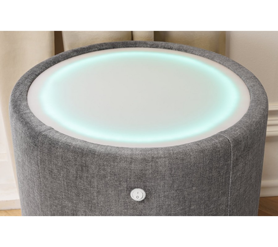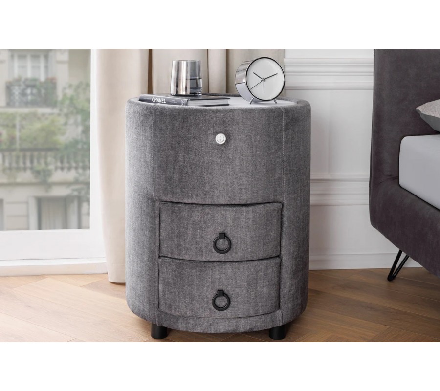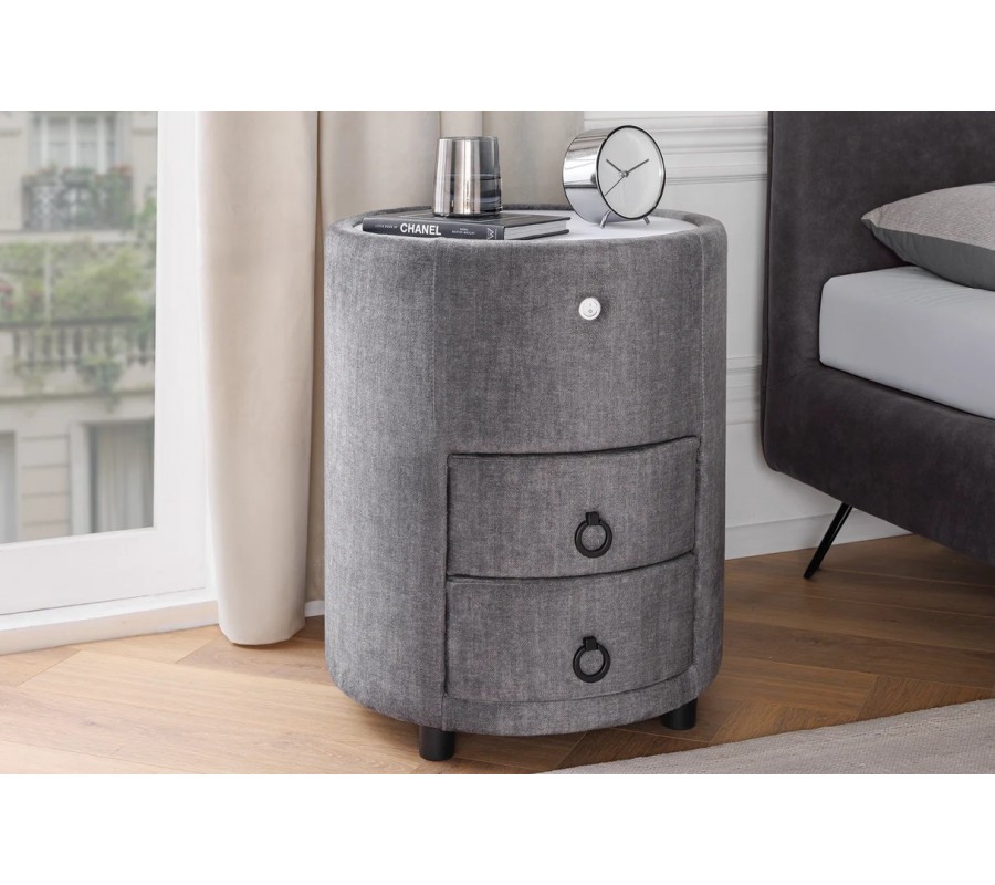 Noční stolek mohutnou siluetu s kulatým půdorysem, která je po obvodu překryta sametovým potahem v šedé barvě. Mikrovlákno mu zaručuje výbornou odolnost a nábytek tak vydrží dlouho krásný. Vrchní deska v bílé barvě má mírně vyvýšené okraje a zabudované LED podsvícení, které se ovládá pomocí kulatého bílého vypínače na přední fasádě stolku.