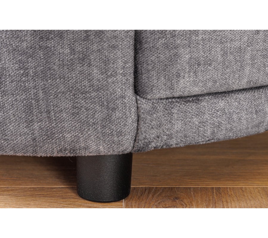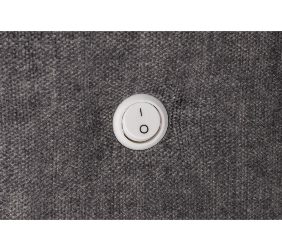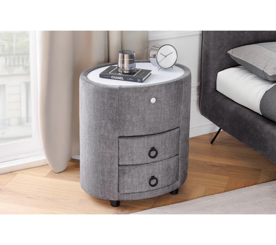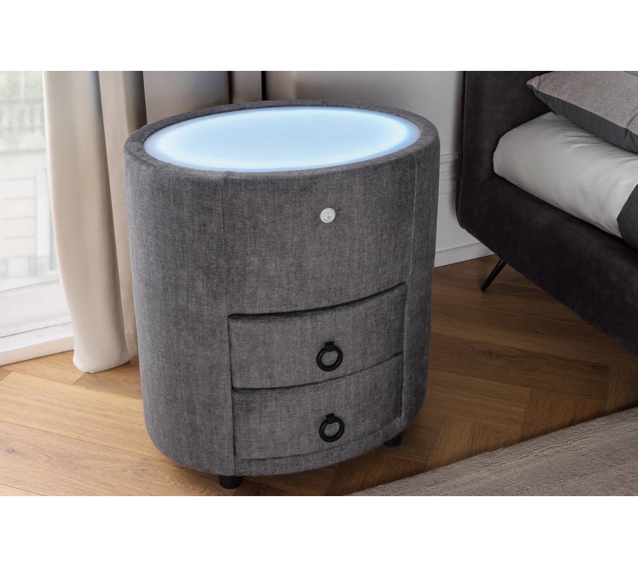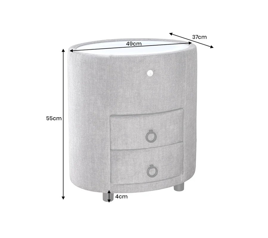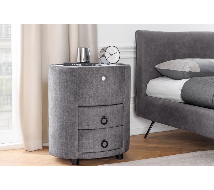 Noční stolek má elegantní plnou oválnou siluetu se čtyřmi nízkými válcovitými nožičkami. Korpus pokrývá sametový potah v šedé barvě. Ve spodní části jsou nad sebou umístěny dvě zásuvky s interiérem v čisté bílé barvě. Doplňuje je kulatá visící úchytka v černé barvě, která koresponduje s barevným provedením nožiček. Bílá vrchní deska má mírně vyvýšené okraje a praktické zabudované LED podsvícení, které se ovládá pomocí kulatého vypínače na přední části stolku.