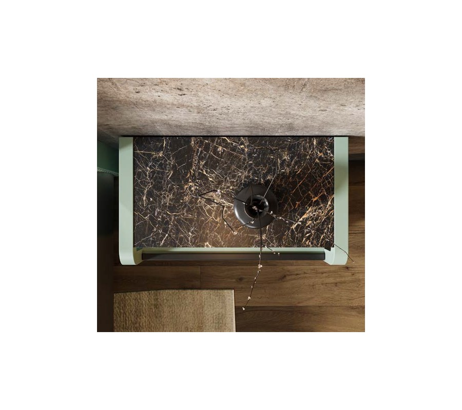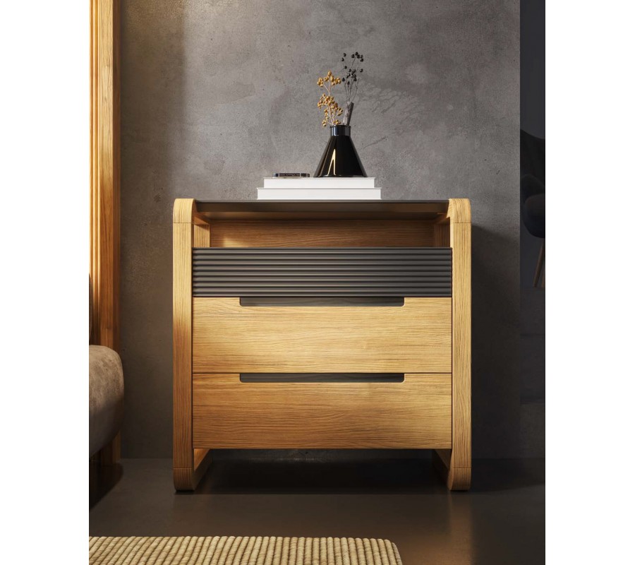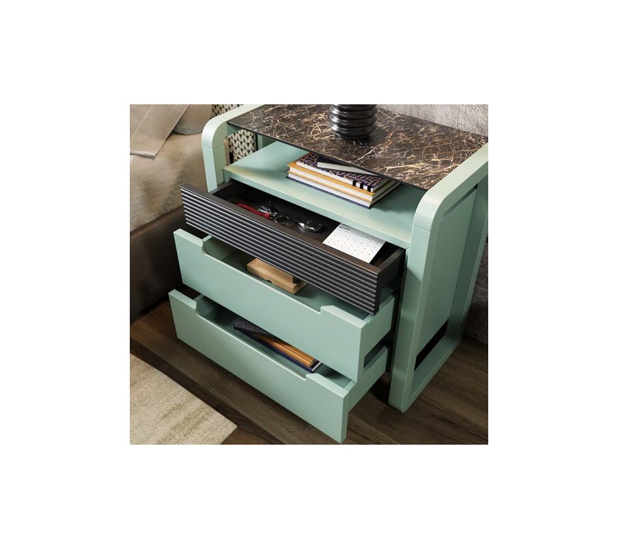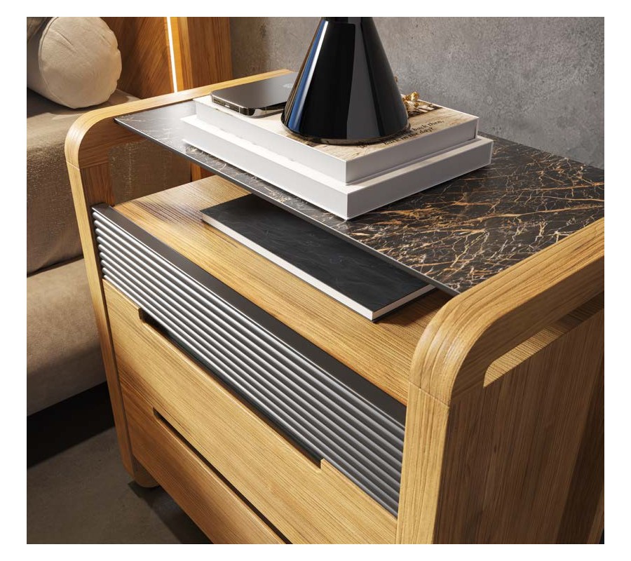 Úložný prostor tvoří dvojice zásuvek s hladkým čelem, nad kterými se nachází dekorativní panel s horizontálním vroubkováním – výrazný prvek kolekce Berna. Vrchní plocha je řešena jako tenká deska v mramorovém designu s jemným leskem, která dodává stolku luxusní charakter.