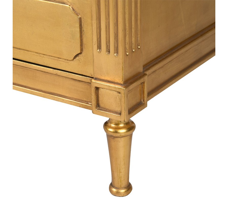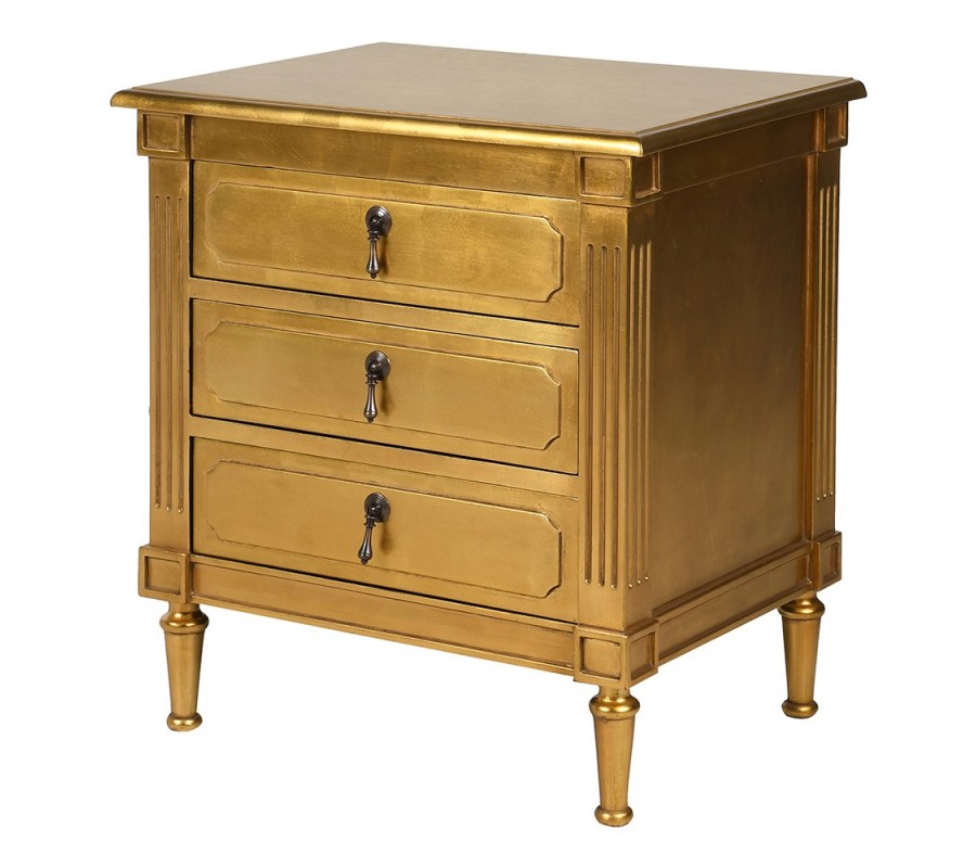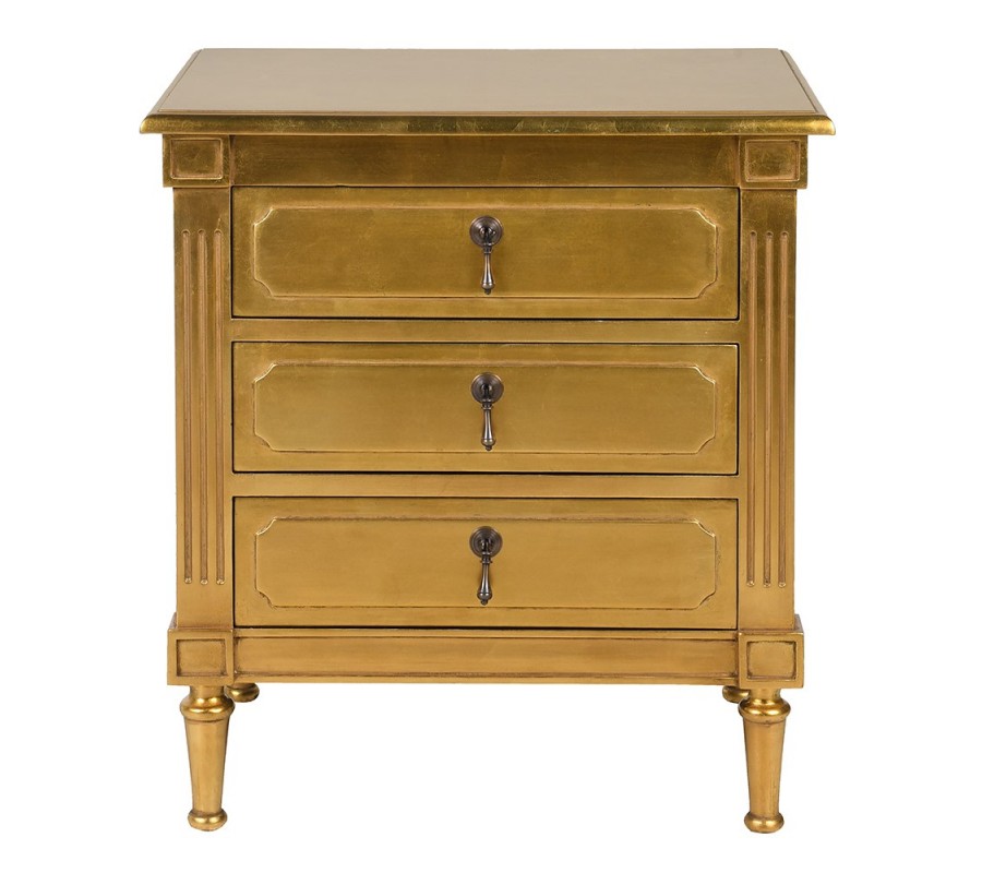 Luxusní glamour noční stolek Dimitria ve zlaté barvě z mahagonového dřeva a s drážkováním se třemi zásuvkami