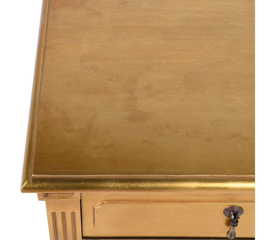 Úložný prostor tvoří tři zásuvky, které jsou zasazeny do čel s jemným reliéfním orámováním. Plastické detaily dodávají stolku hloubku a vytvářejí sofistikovanou hru světla a stínu. Zásuvky doplňují kovové úchyty v tmavším zlatém až bronzovém tónu, které působí elegantně, kontrastně a zároveň funkčně.