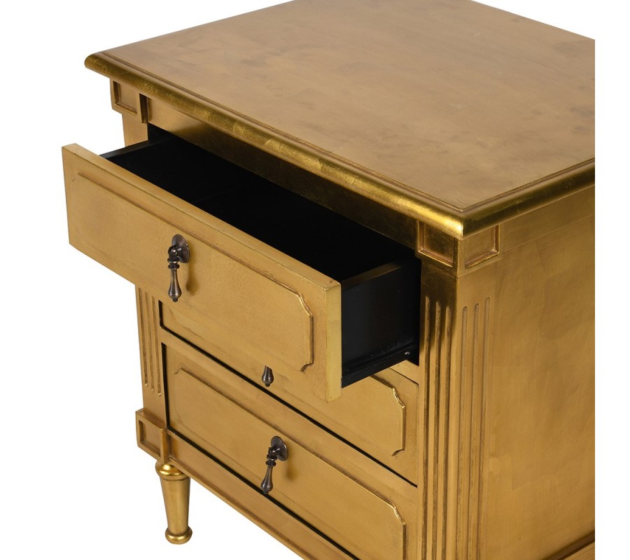 Luxusní glamour noční stolek Roi Gilt ve zlaté barvě z mahagonového dřeva s jemnou patinou a drážkováním se třemi zásuvkami