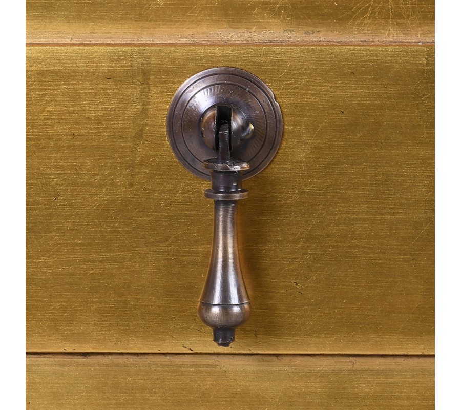 Tvar stolku je kompaktní a harmonický, s důrazem na symetrii a elegantní proporce. Povrchová úprava v teplém zlatém odstínu s jemnou patinou dodává nábytku luxusní, mírně historizující charakter.