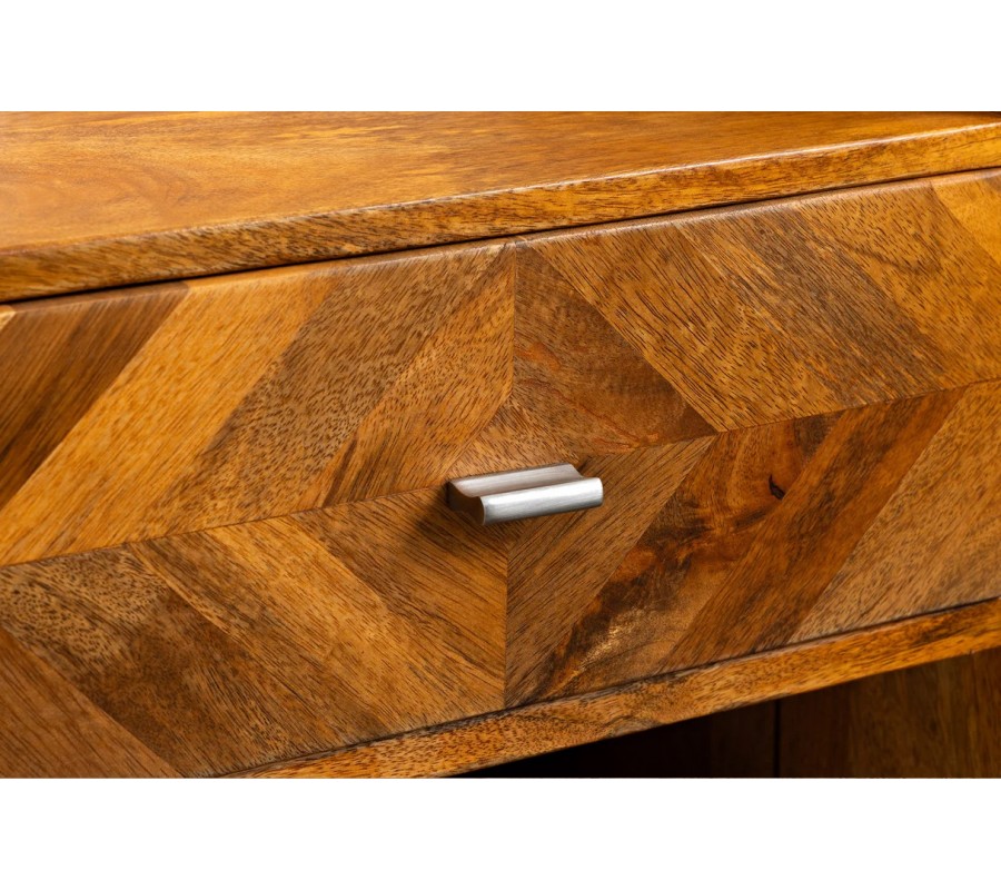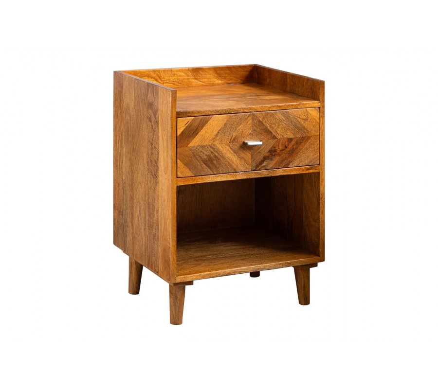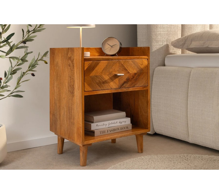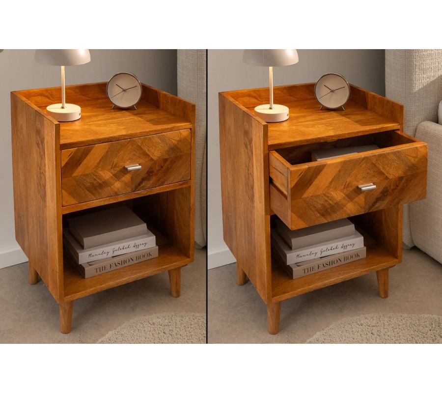 Stolek disponuje jednou zásuvkou s dekorativní mozaikou, která poskytuje úložný prostor pro drobnosti, knihy či osobní věci. Zásuvka je doplněna kovovou úchytkou ve stříbrné barvě, která vytváří jemný kontrast k teplému tónu dřeva. Pod zásuvkou se nachází otevřená police, ideální pro knihy nebo designové doplňky.