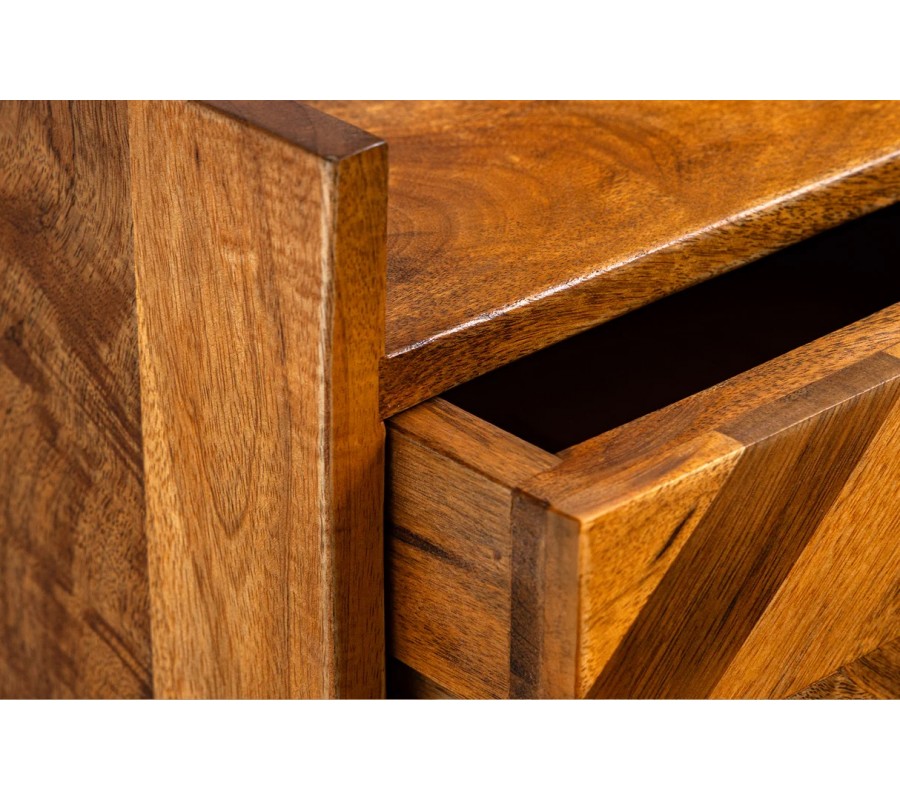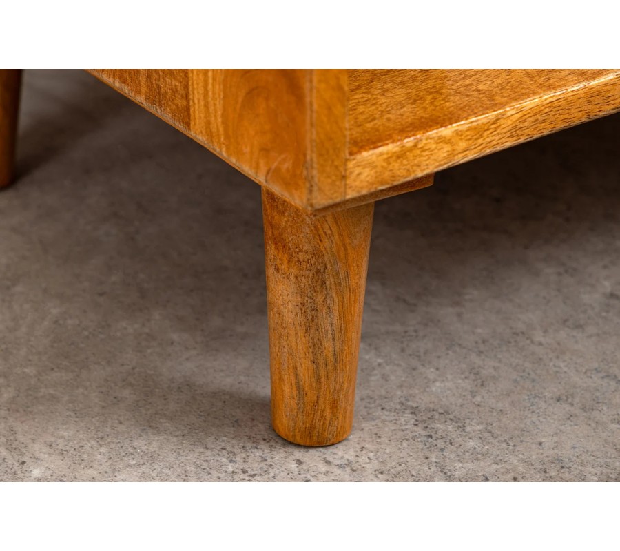 Designový masivní noční stolek Frida je stylovým a praktickým doplňkem do ložnice, který je vyhotoven z masivního mangového dřeva v teplém hnědém odstínu, který dodává interiéru útulnou atmosféru. Mangové dřevo je známo svojí pevností, odolností a jedinečnou kresbou, přičemž každý kus nábytku je originál s vlastním charakterem. Tento přírodní materiál je rovněž ekologickou volbou s dlouhou životností.