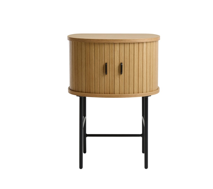 Noční stolek disponuje vrchní deskou v půlkruhovém tvaru, se zarovnanou zadní hranou a zaoblenou přední částí. Hladký povrch zvýrazňuje přirozenou kresbu dřeva, která dodává nábytku přírodní charakter. Pod deskou se nachází úložný prostor uzavíratelný dvojicí posuvných dvířek s vertikálním lamelovým dekorem, inspirovaným retro stylem. Dvířka doplňují dvě svislé zaoblené úchytky. Vnitřní prostor je rozdělen na dvě police umístěné nad sebou.