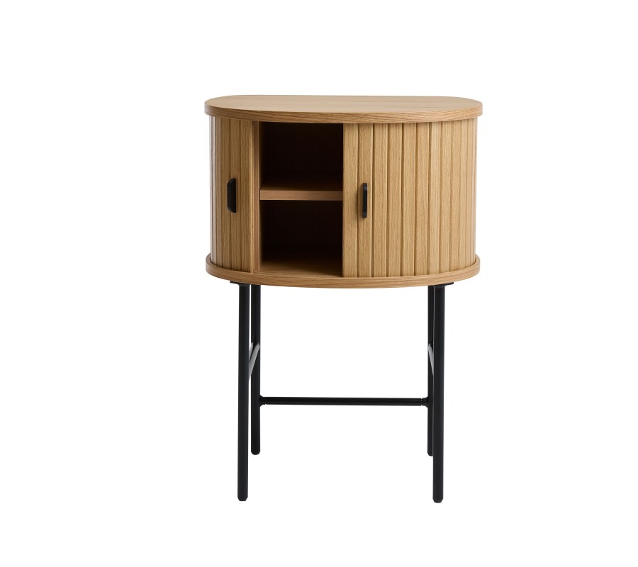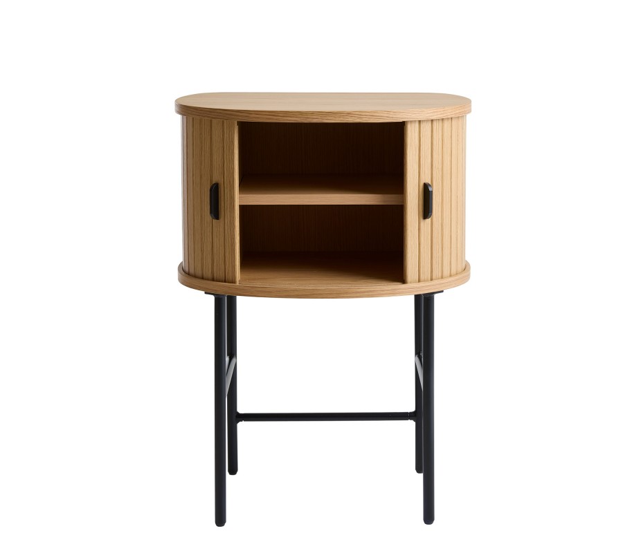 Skandinávský noční stolek Bornholm ve světlém hnědém dubovém provedení s posuvnými dvířky a černými kovovými nohami 70 cm