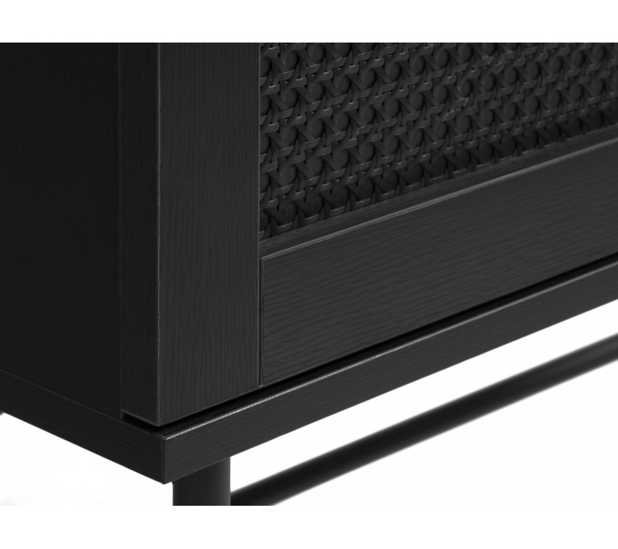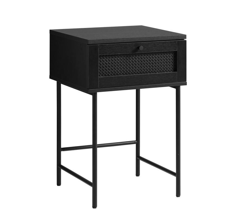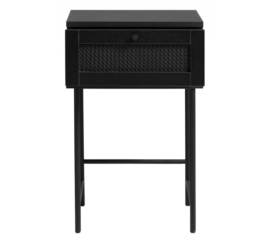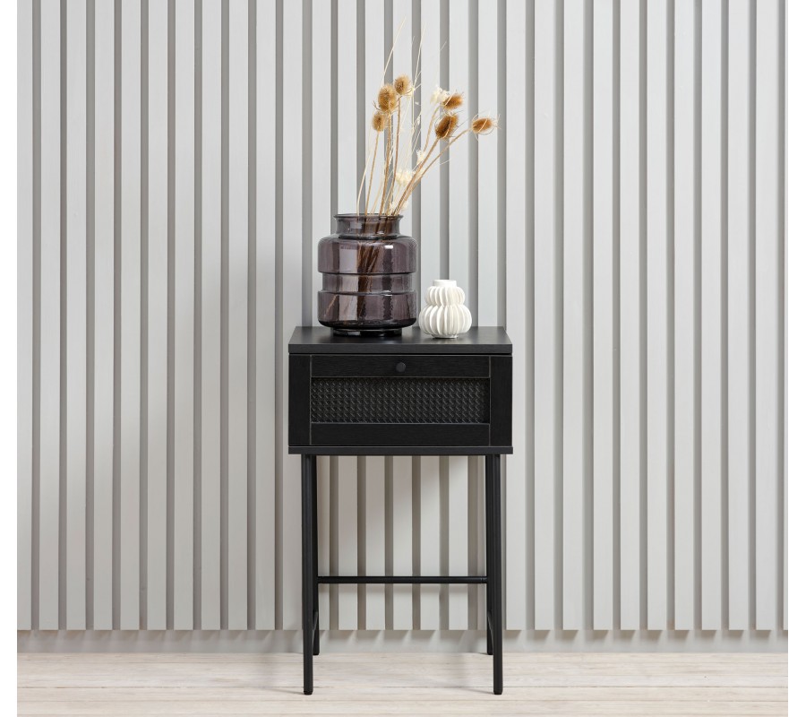 Vrchní část je vyrobena z MDF dýhy s melaminovou povrchovou úpravou, zaručující vysokou odolnost vůči vlivům každodenního používání. Doplňuje ji jemná struktura letokruhů, dodávající nábytku teplý charakter. Pod čtvercovou deskou se nachází jedna zásuvka s kulatým kovovým úchytem. Její fasádu zdobí ratanový výplet s vídeňským vzorem, který přináší do designu dekorativní akcent v retro stylu.