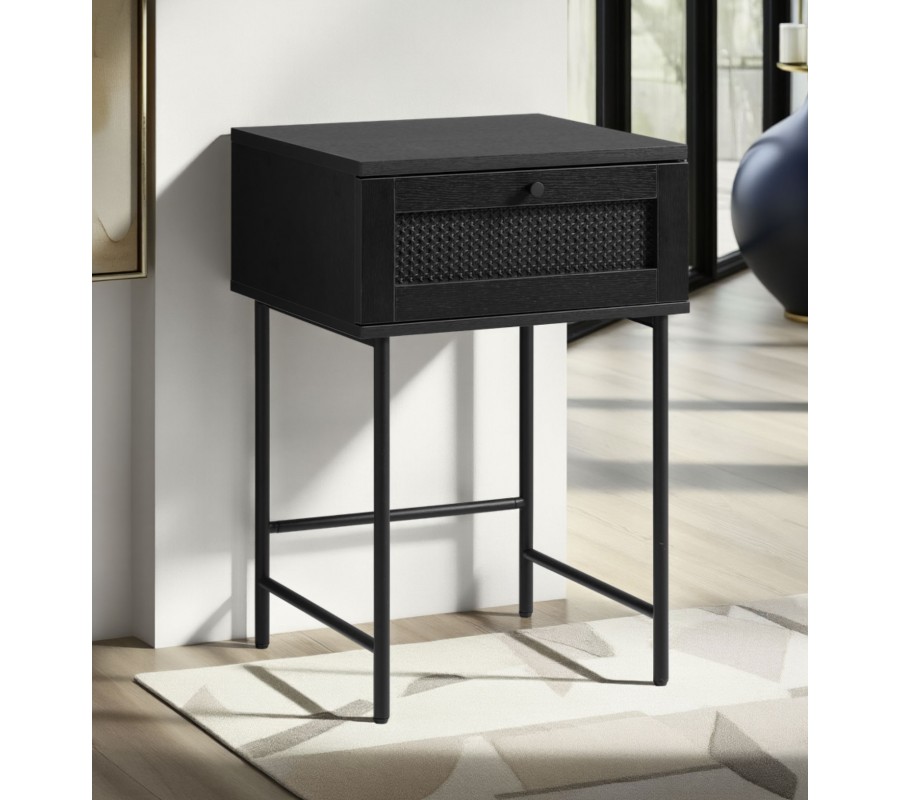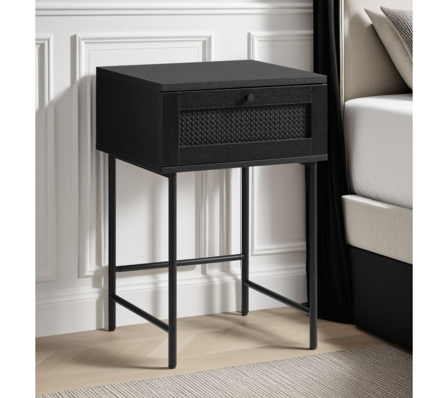 Industriální retro černý noční stolek Malmo se šuplíkem s ratanovým vídeňským výpletem a vysokými kovovými nohama 45 cm