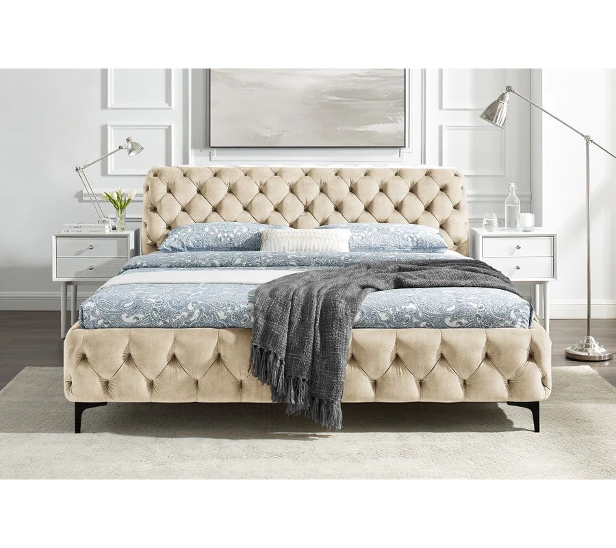 Postel je čalouněna kvalitním sametovým potahem v béžovém odstínu šampaňského, který působí mimořádně jemně, hřejivě a luxusně zároveň. Samet je příjemný na dotek av závislosti na dopadu světla vytváří elegantní odlesky, díky čemuž postel krásně vyniká. Stabilní konstrukci doplňují štíhlé kovové nožičky v černé barvě, které vytvářejí moderní kontrast k jemnému čalounění, zajišťují pevnou stabilitu a zároveň umožňují snazší čištění pod postelí.