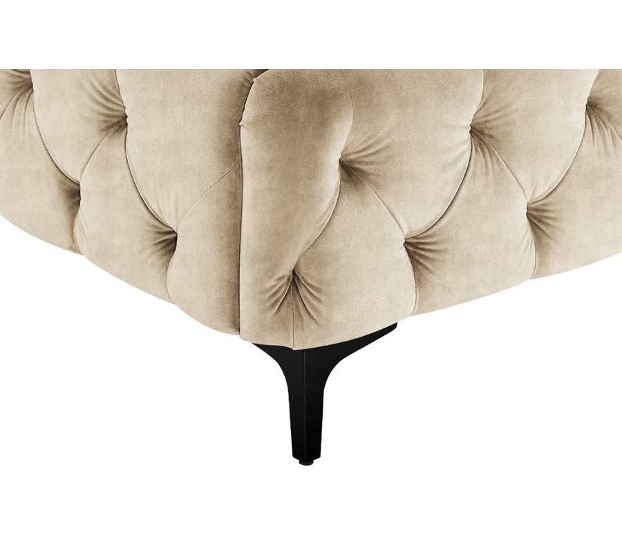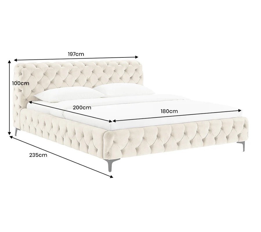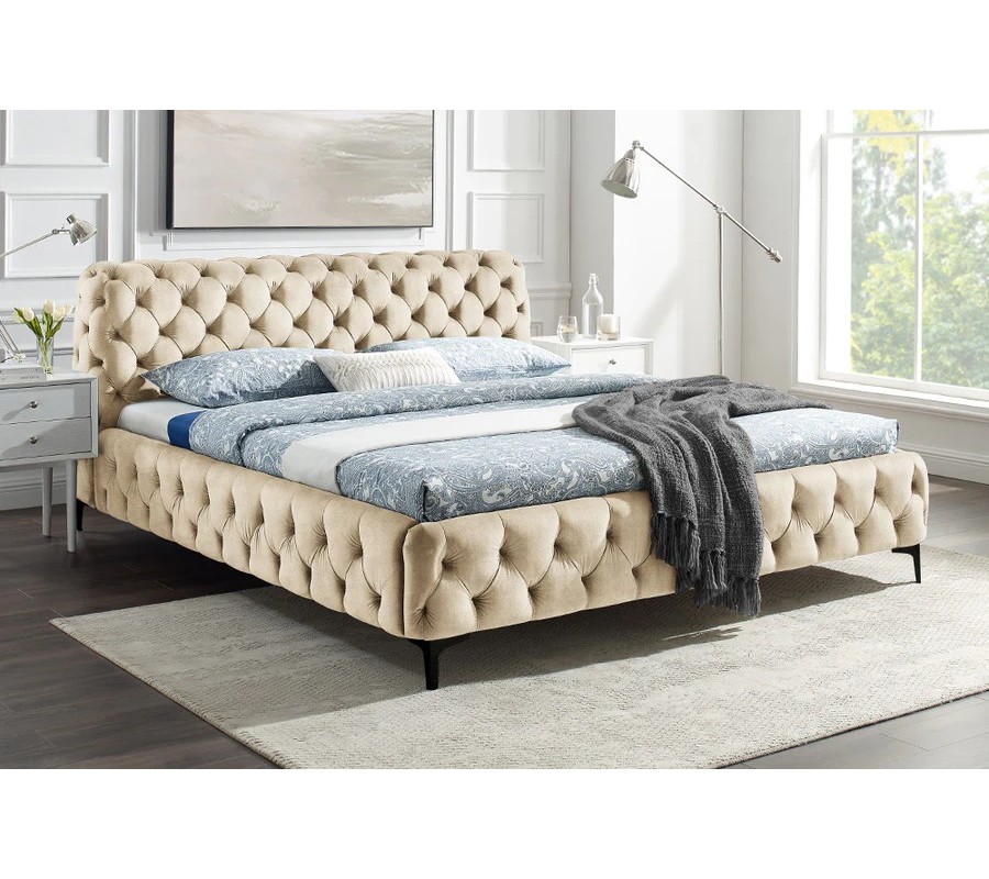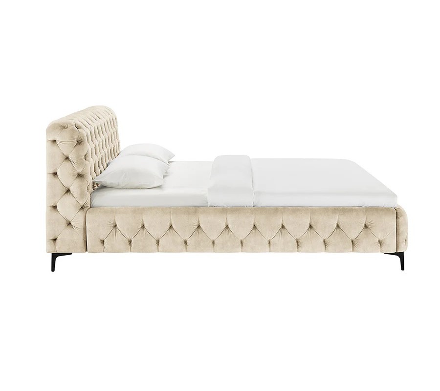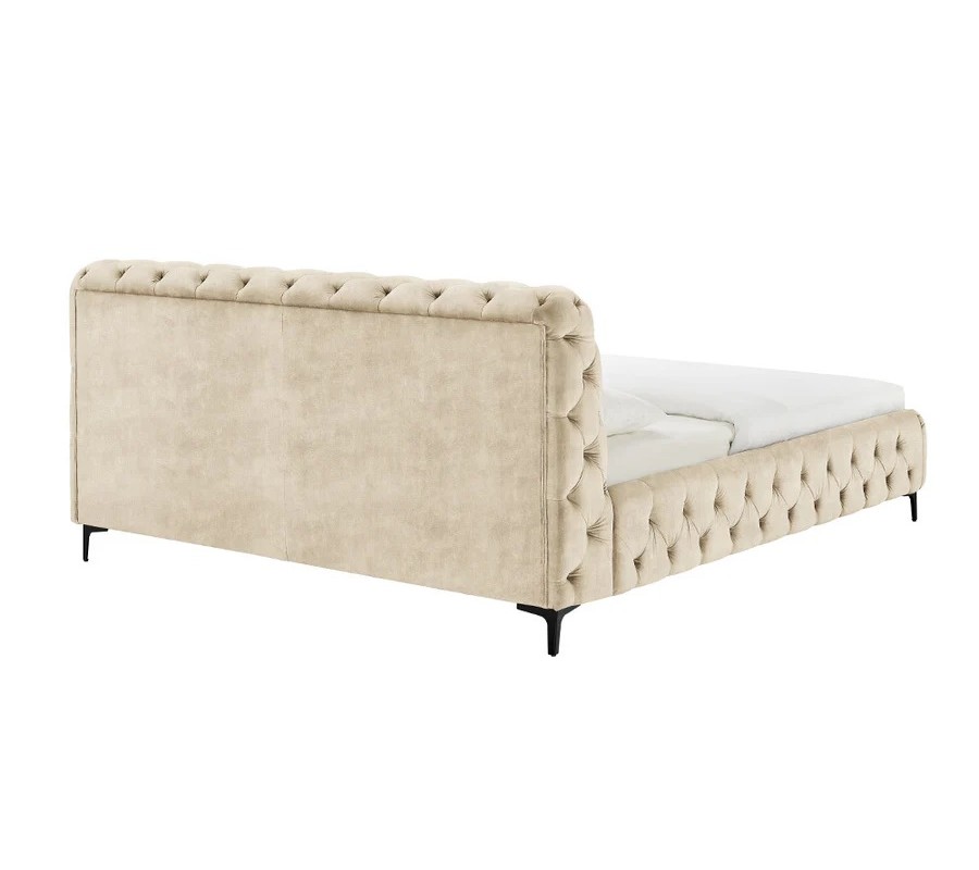 Postel je čalouněna kvalitním sametovým potahem v béžovém odstínu šampaňského, který působí mimořádně jemně, hřejivě a luxusně zároveň. Samet je příjemný na dotek av závislosti na dopadu světla vytváří elegantní odlesky, díky čemuž postel krásně vyniká. Stabilní konstrukci doplňují štíhlé kovové nožičky v černé barvě, které vytvářejí moderní kontrast k jemnému čalounění, zajišťují pevnou stabilitu a zároveň umožňují snazší čištění pod postelí.