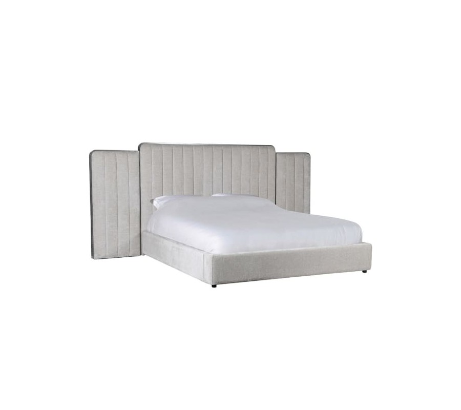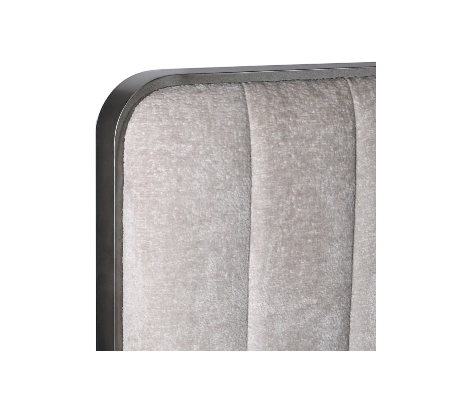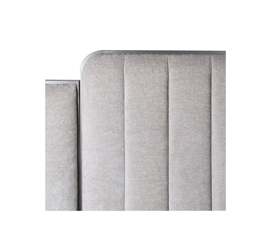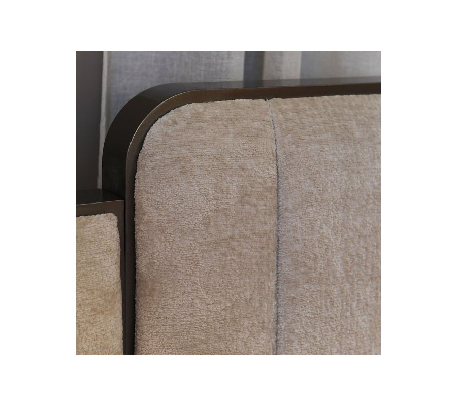 Nejvýraznějším prvkem je velké čelo složené ze tří obdélníkových částí, přičemž střední část je největší a nejvyšší, zatímco dvě boční jsou užší a stejně vysoké. Všechny části zdobí vertikální prošívání, které postel opticky prodlužuje a dodává jí moderní, luxusní charakter. Čelo je navíc lemováno decentním kovovým rámem, který mu dodává jemný nádech art deco stylu.