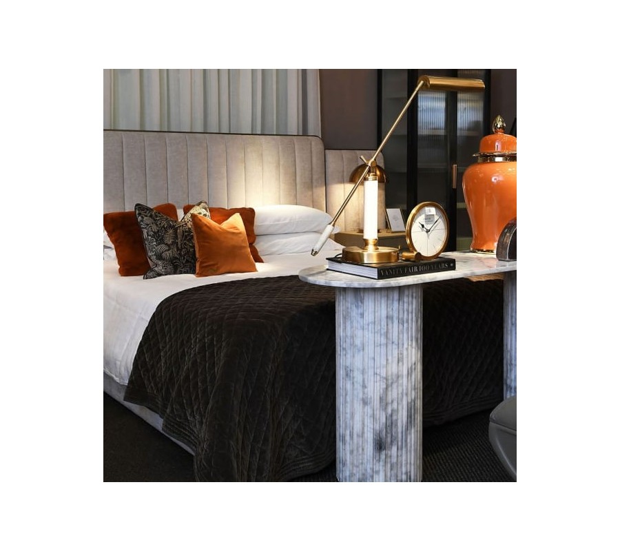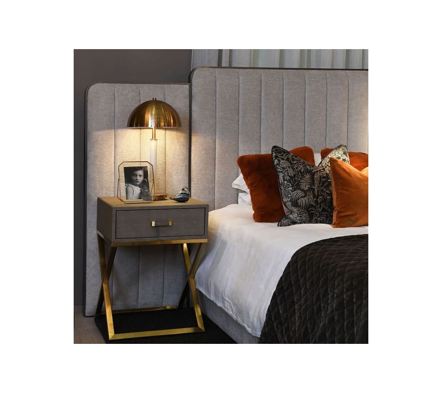 Hodí se do moderních, minimalistických i glamour ložnic, kde vynikne jako hlavní designový prvek. Skvěle se kombinuje s nočními stolky se skleněnými nebo kovovými detaily, luxusními textiliemi v odstínech bílé, šedé či tmavě modré a se stylovým osvětlením – například nástěnnými lampami nebo stojícími svítidly s kovovými prvky.