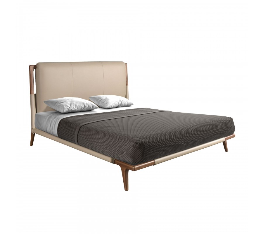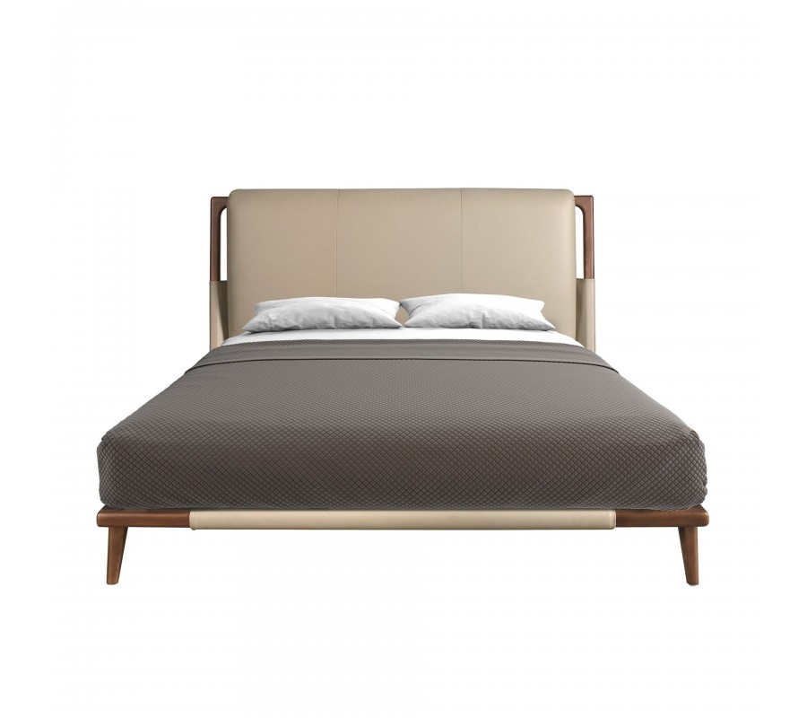 Luxusní moderní manželská postel Charmoin s béžovým čalouněným čelem z ekokůže s ořechově hnědým masivním rámem 188 cm