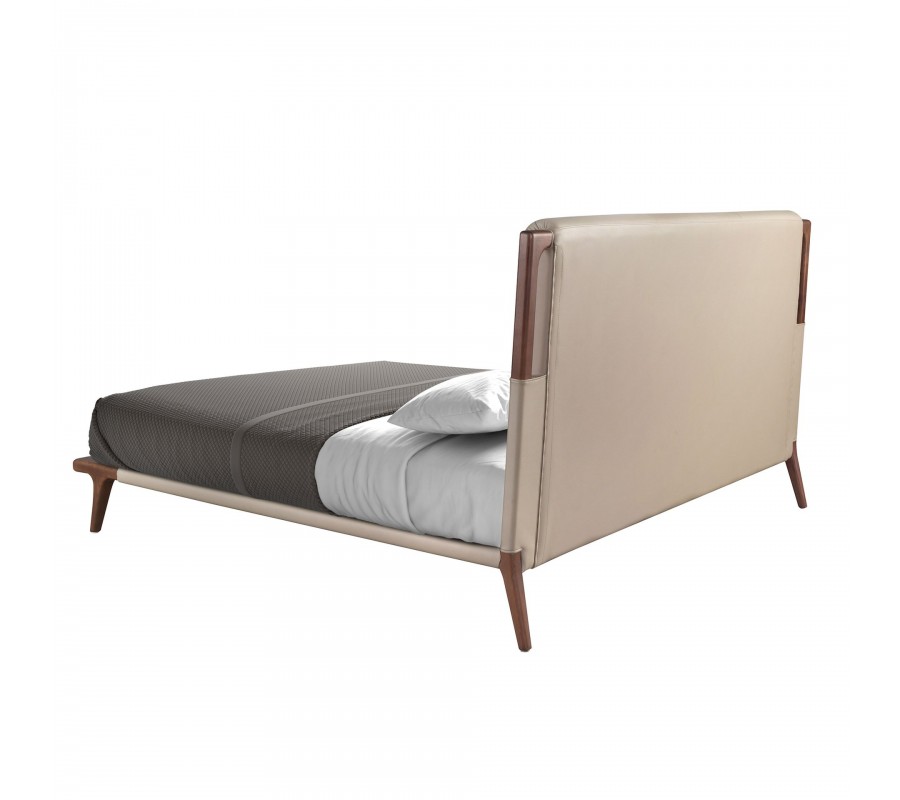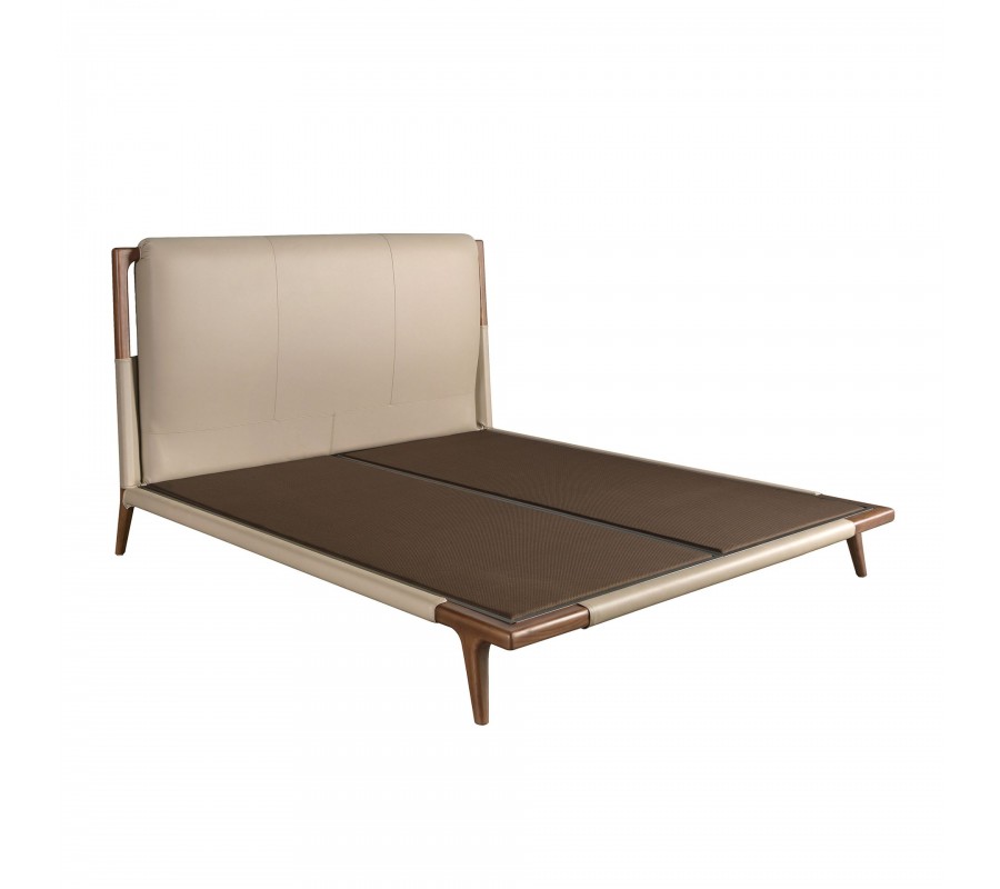 Čalouněné čelo nechává odhalené vrchní rohy rámu, což vytváří zajímavý designový element. Na stranách je připojeno k rámu pomocí širokých kožených úchytek. Stejný prvek se opakuje i na patě a bočních stranách postele. Povrch základny je pokryt hnědou protiskluzovou látkou a postel je kompatibilní s matrací o rozměru 180x200 cm.