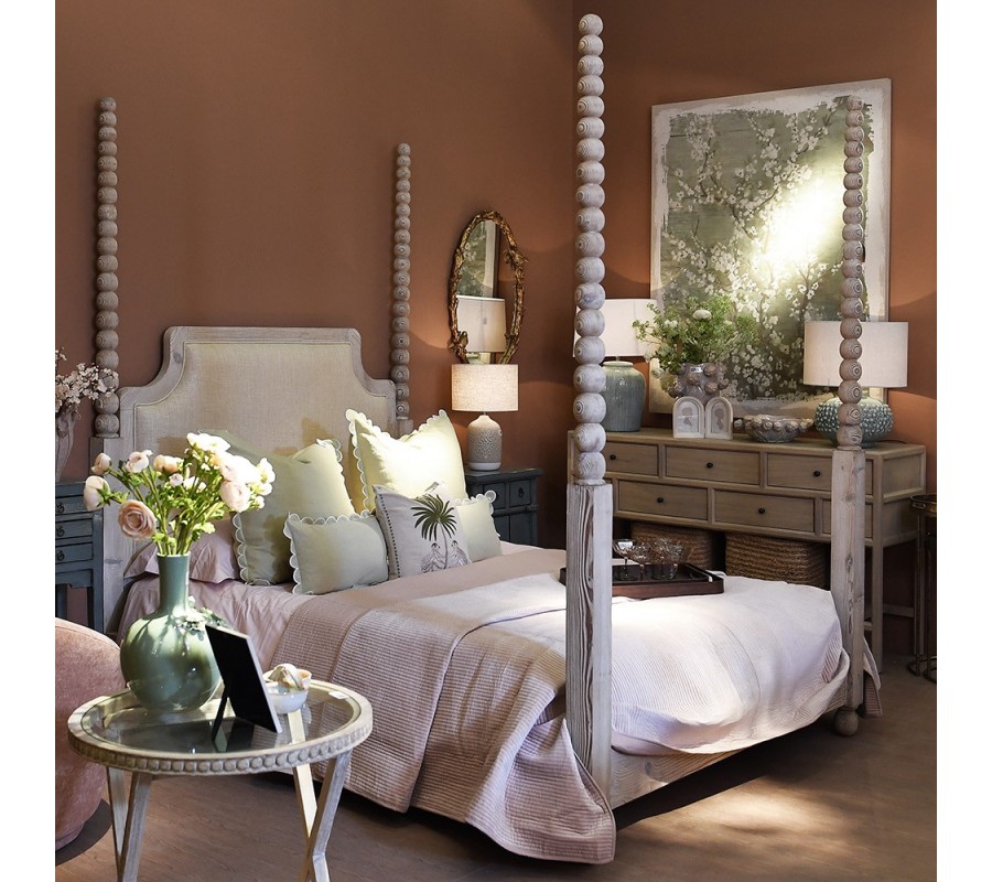 Manželská postel Boia je ideální volbou do ložnice zařízené ve venkovském stylu, kde ji můžete doplnit textiliemi a prádlem s elegantními florálními vzory či noční lampou s keramickou podstavou. Hodí se k ní i noční stolek s patinovanou povrchovou úpravou ve vintage stylu či komoda s vyřezávaným zdobením z běleného dřeva. Do prostoru přinese luxusní dominantní prvek, který zároveň působí teplým přírodním dojmem.