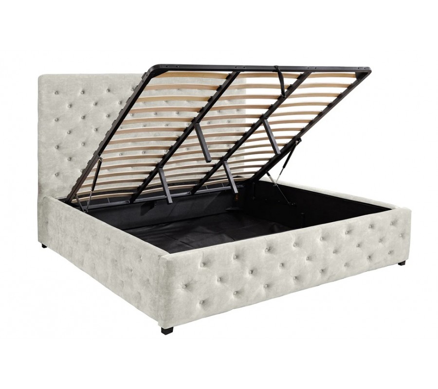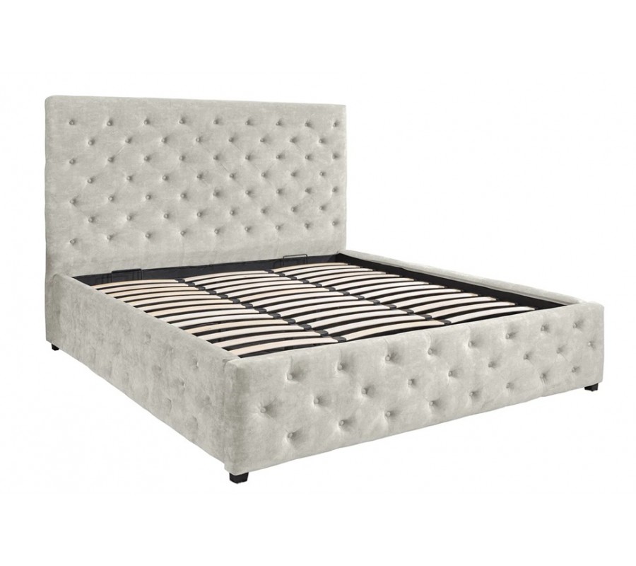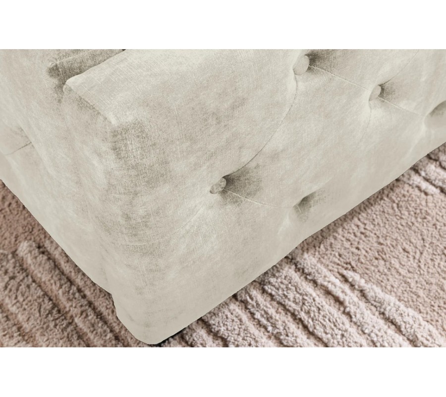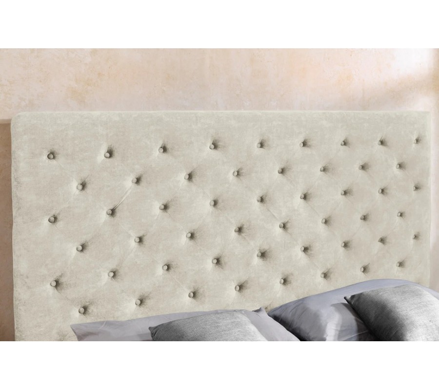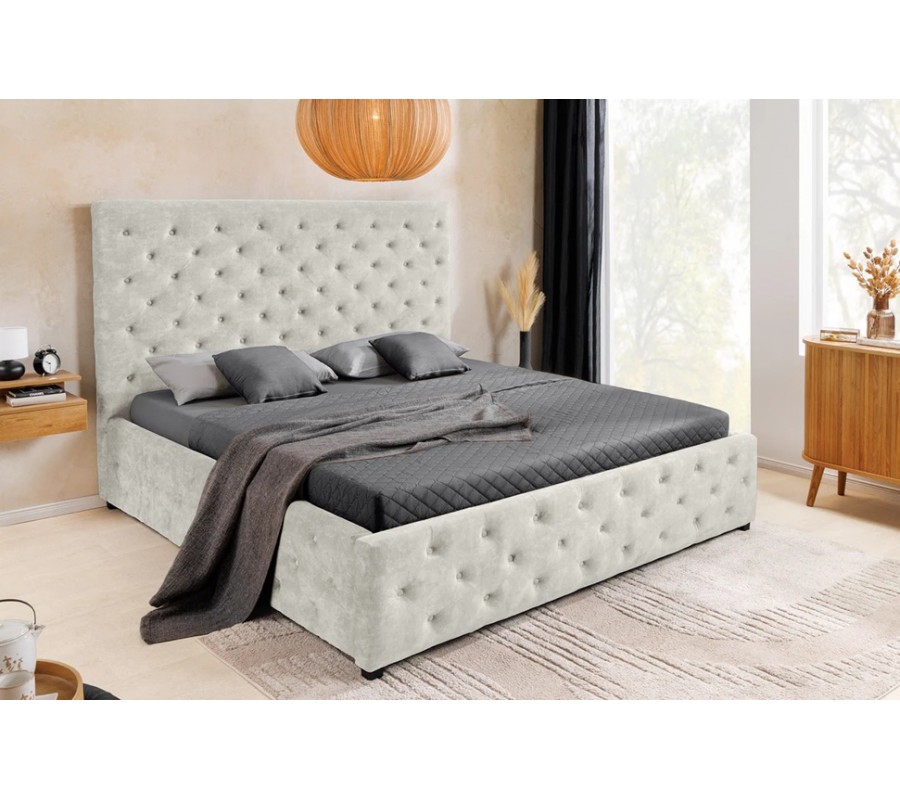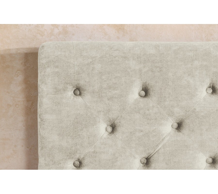 Postel má pevnou konstrukci z masivního dřeva, kterou na obdélníkové základně a vysokém čele pokrývá pěnové čalounění se sametovým potahem. Textilie z mikrovlákna je příjemná a dotek a zaručí výbornou odolnost vůči vlivům každodenního používání. Provedení v krémové béžové barvě šampaňského doplňuje prošívání v chesterfield stylu s kulatými knoflíky, které udělá z vysokého čela luxusní dominantu místnosti.