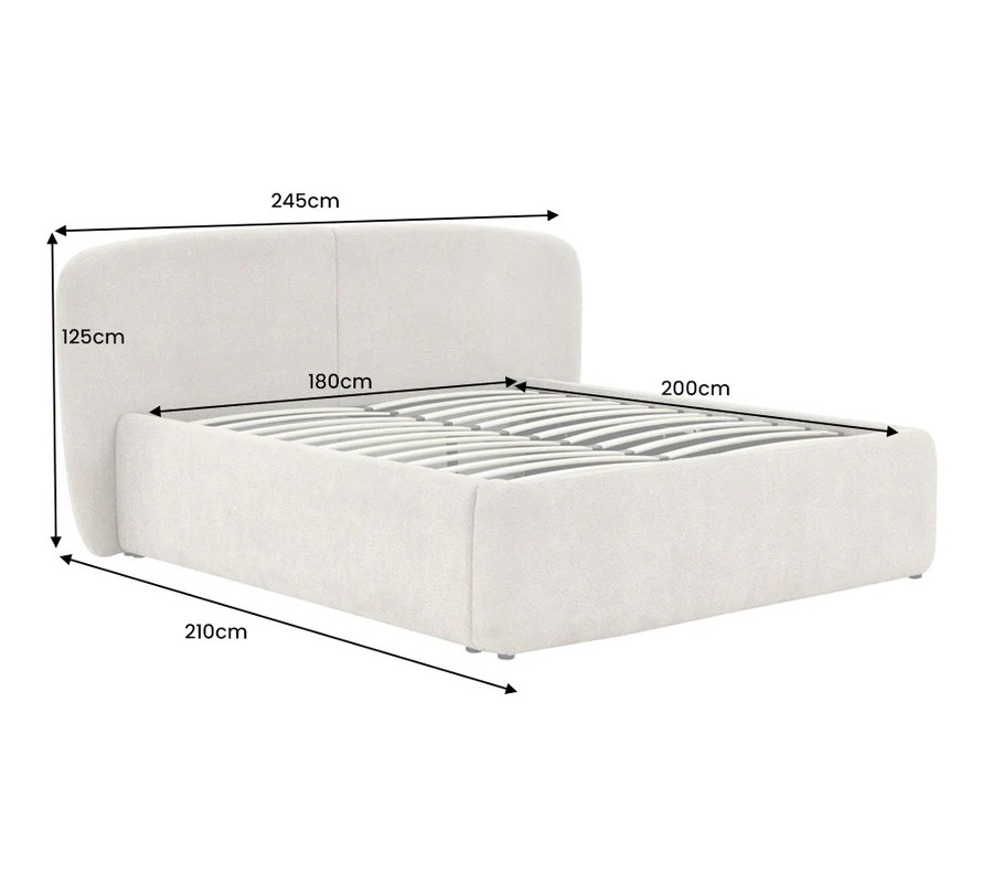 Dominantním prvkem je široké čelo postele se zaoblenými vrchními hranami. Jeho oblý tvar navozuje harmonický dojem a zároveň působí měkce na pohled i dotek. Boční i spodní hrany postele plynule navazují na čalounění bez ostrých linek, takže celek působí kompaktním designovým dojmem. Tento typ tvarování a potahu je výhodný iz hlediska bezpečnosti – zejména v domácnostech s dětmi, kde zaoblené části snižují riziko úrazu.