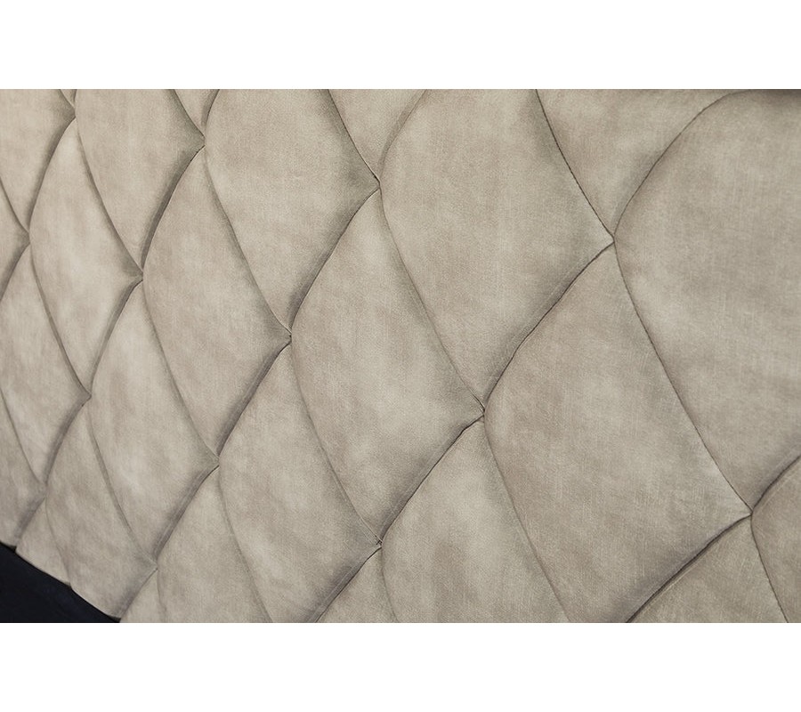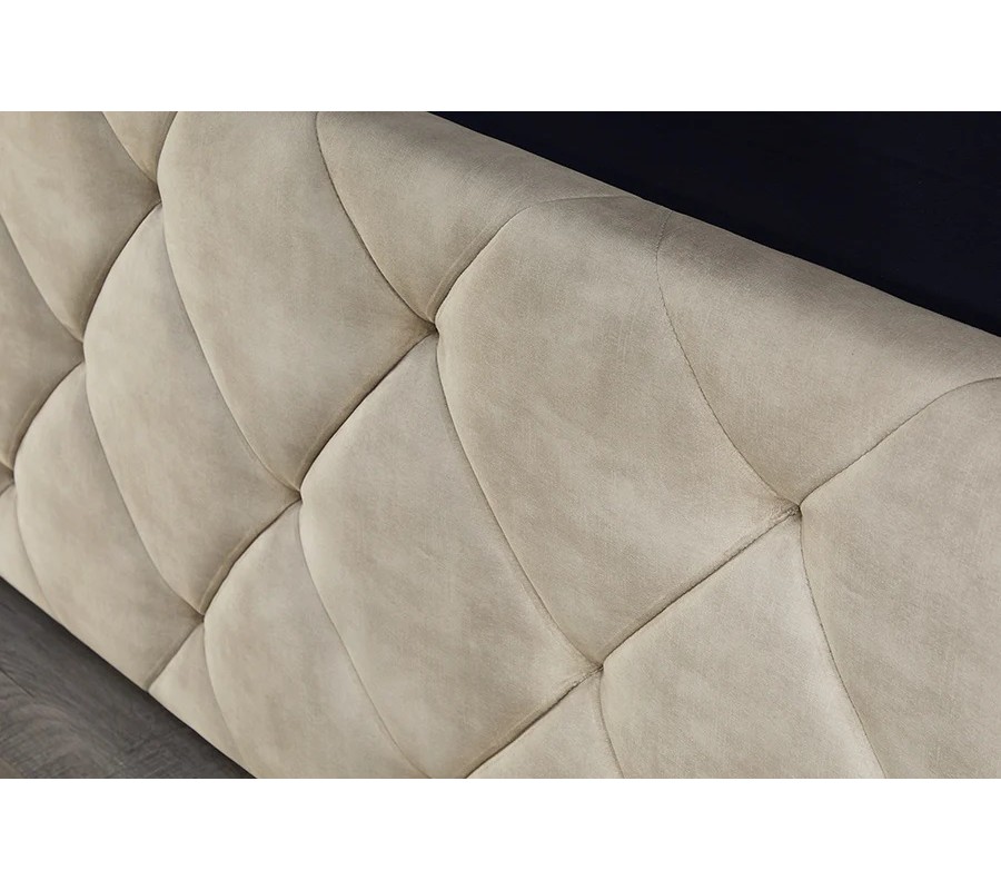 Boční části základny jsou čalouněné, s hladkým sametovým potahem. Ve stejném provedení je vyrobeno i obdélníkové čelo a vyvýšená pata, ale doplňuje je ještě geometrické prošívání s diagonálním diamantovým vzorem. Světlá béžová barva působí elegantním dojmem, zatímco mikrovlákno zaručuje výbornou odolnost vůči vlivům každodenního používání.