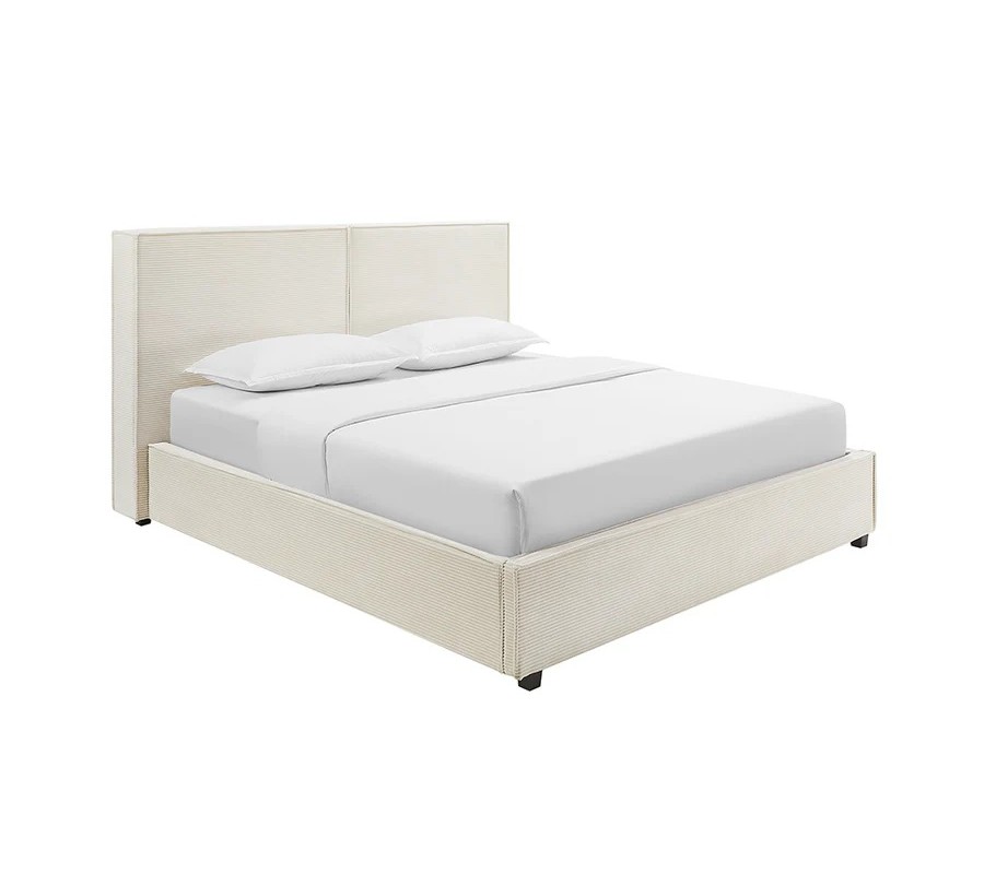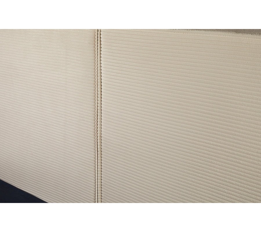 Postel má pevnou konstrukci z kombinace masivního dřeva a kovu. Základnu i čelo pokrývá čalounění s potahem z mikrovlákna, které mu zaručuje vysokou odolnost. Textilie má výraznou lineární strukturu, připomínající manšestr nebo kord, díky čemuž je příjemná na dotek. Světlá béžová barva vytvoří v prostoru pocit tepla a dodává nábytku stylový skandinávský vizuál. Výbornou stabilitu zaručují čtyři nízké hranaté nožičky v decentním černém provedení.