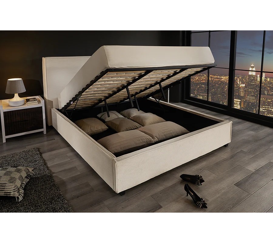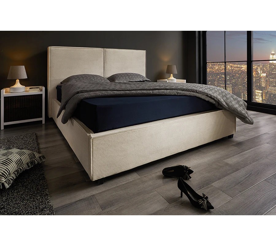 Moderní skandinávská manželská postel Linnea s béžovým manšestrovým potahem a úložným prostorem 205 cm