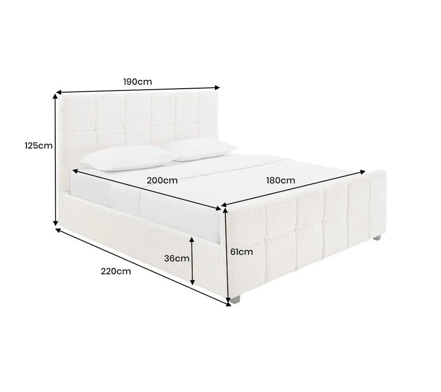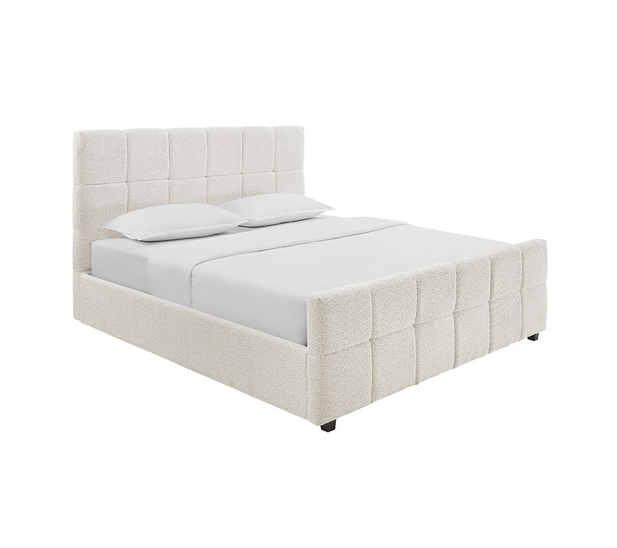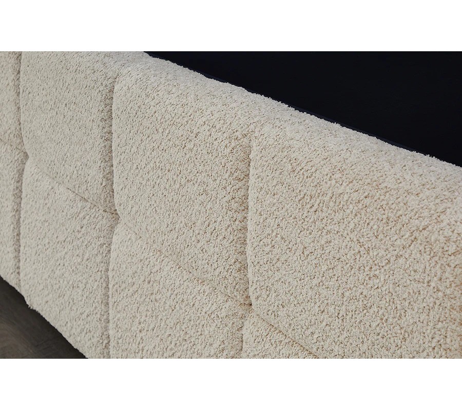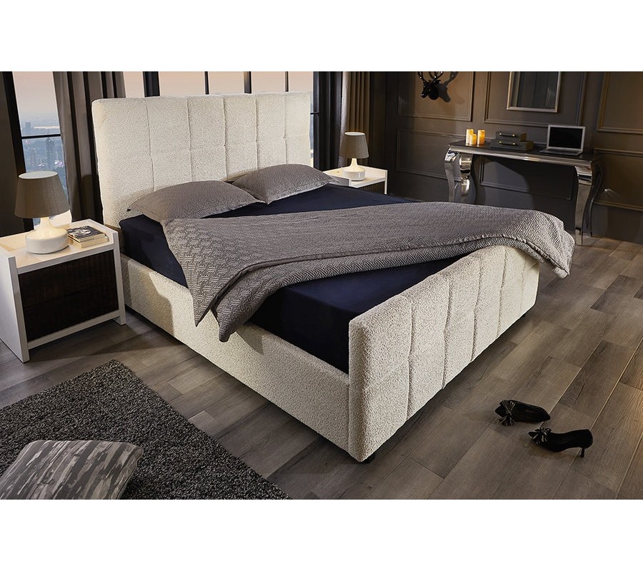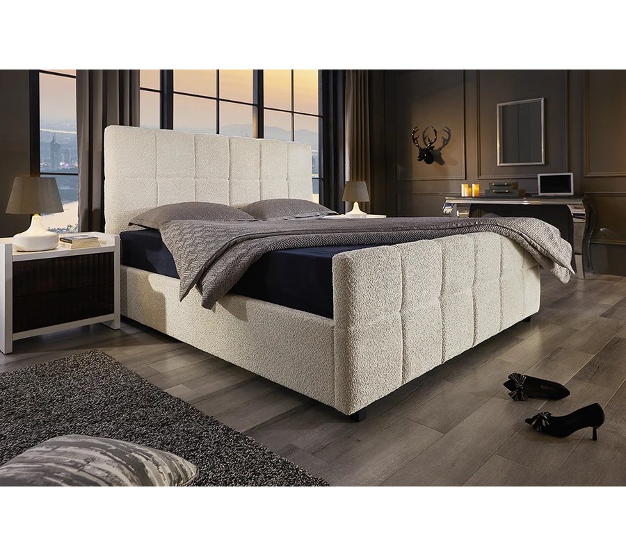 Postel má mohutnou lineární siluetu s čalouněnou základnou, která nabízí prostor pro matraci o rozměru 180x200 cm. Doplňuje ji rovné obdélníkové čelo a vyvýšená pata, které zdobí geometrické prošívání se čtvercovým vzorem. Potah z mikrovlákna má buklé povrchovou úpravu ve světlém krémově béžovém provedení. Bohatá smyčkovitá struktura látky působí měkkým nadýchaným dojmem a je mimořádně příjemná na dotek. Výbornou stabilitu zaručují nízké hranaté nožičky v černé barvě.