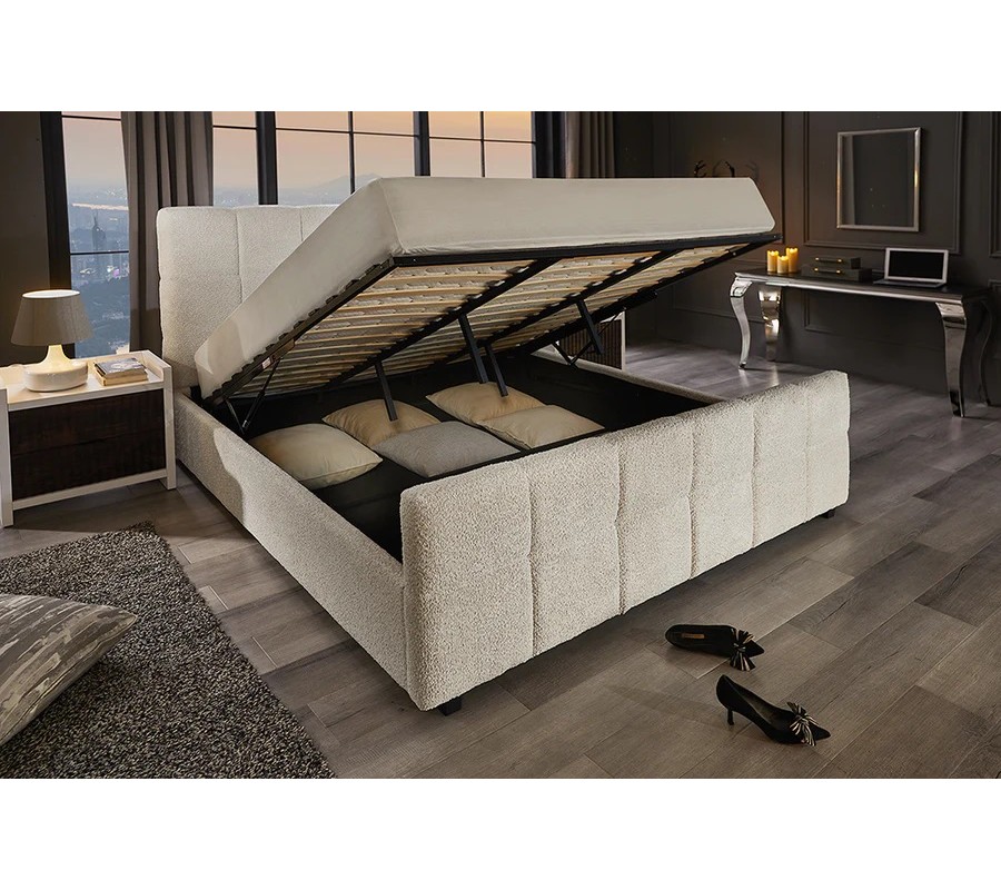 Designová art deco manželská postel Zenni s buklé potahem v krémové barvě se čtvercovým prošíváním a úložným prostorem 190 cm