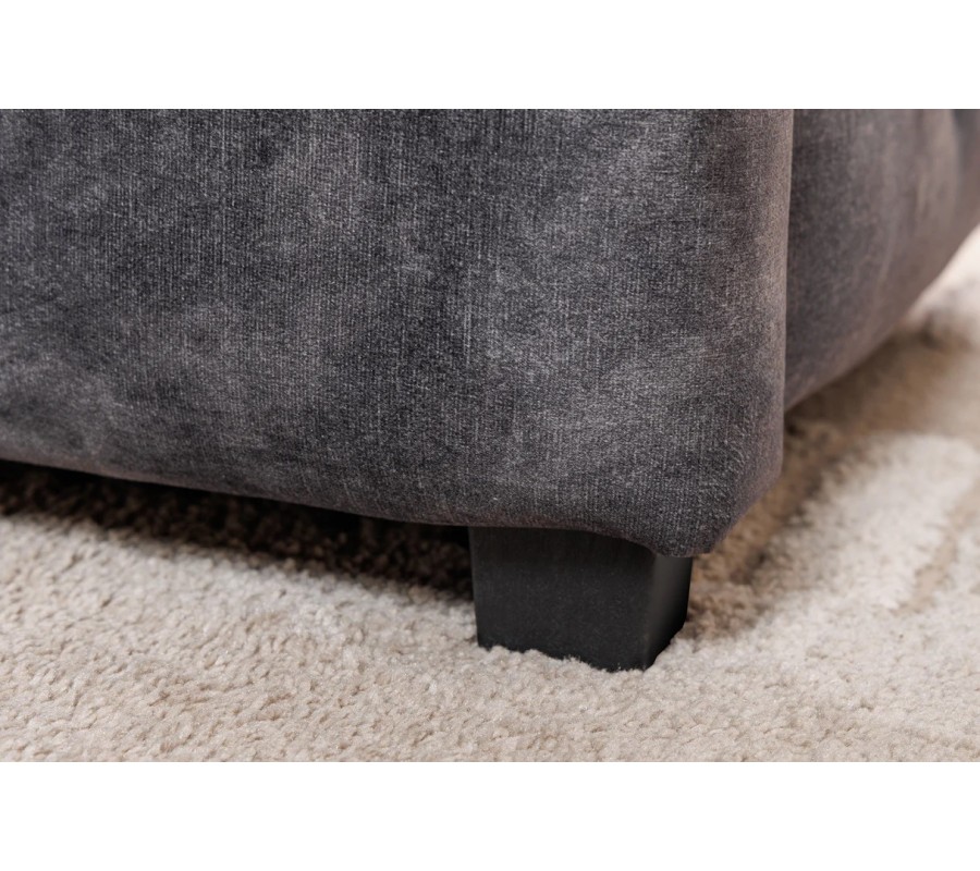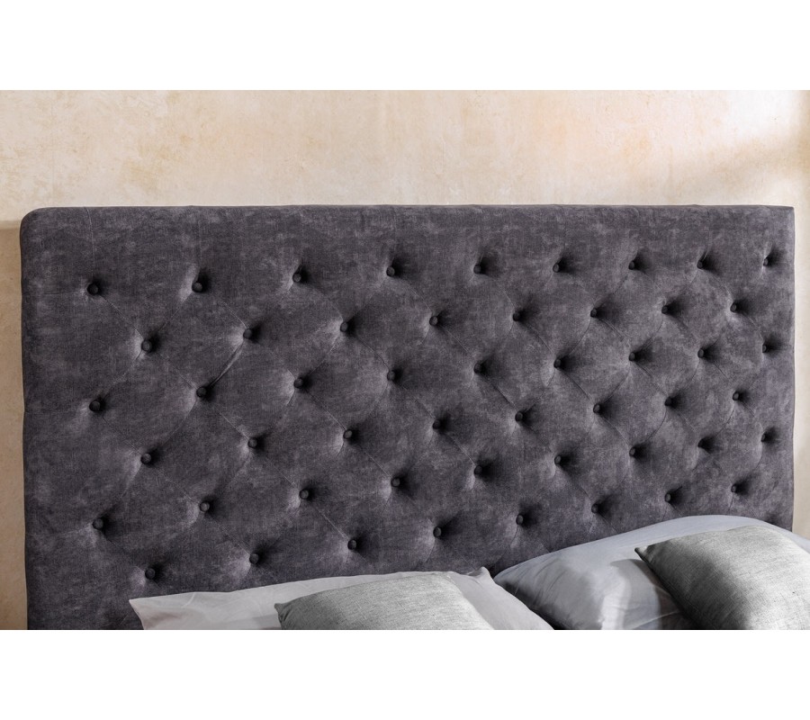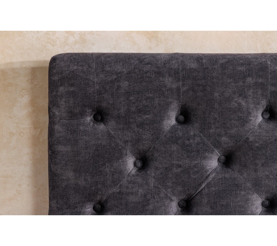 Čelo a základna jsou čalouněné, s potahem z mikrovlákna v tmavě šedé barvě. Textilie má na dotek příjemný sametový finiš a je mimořádně odolná vůči vlivům každodenního používání. Zdobí ji exkluzivní prošívání v chesterfield stylu s hlubokými kulatými knoflíky.