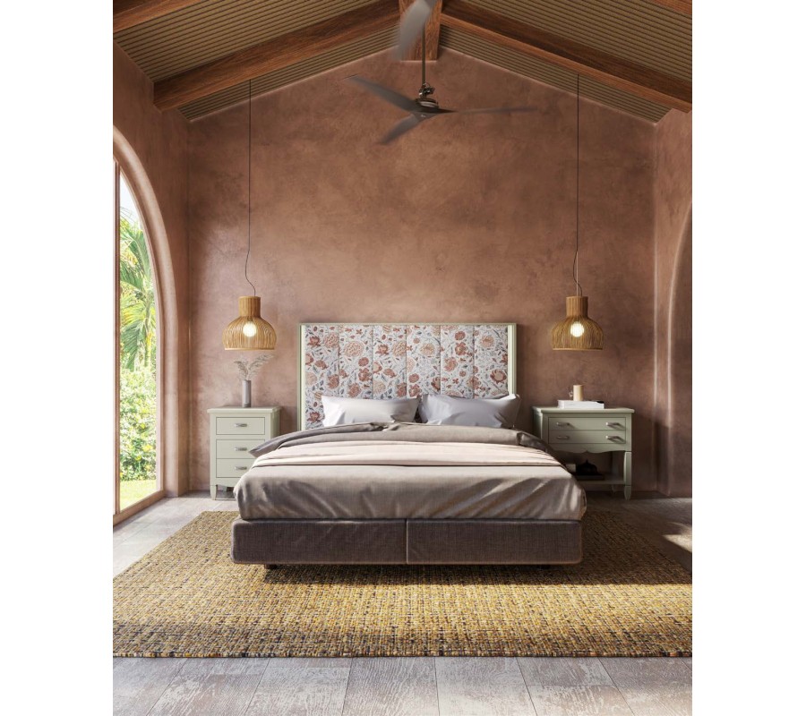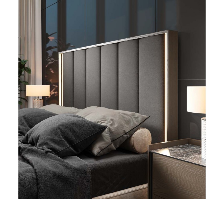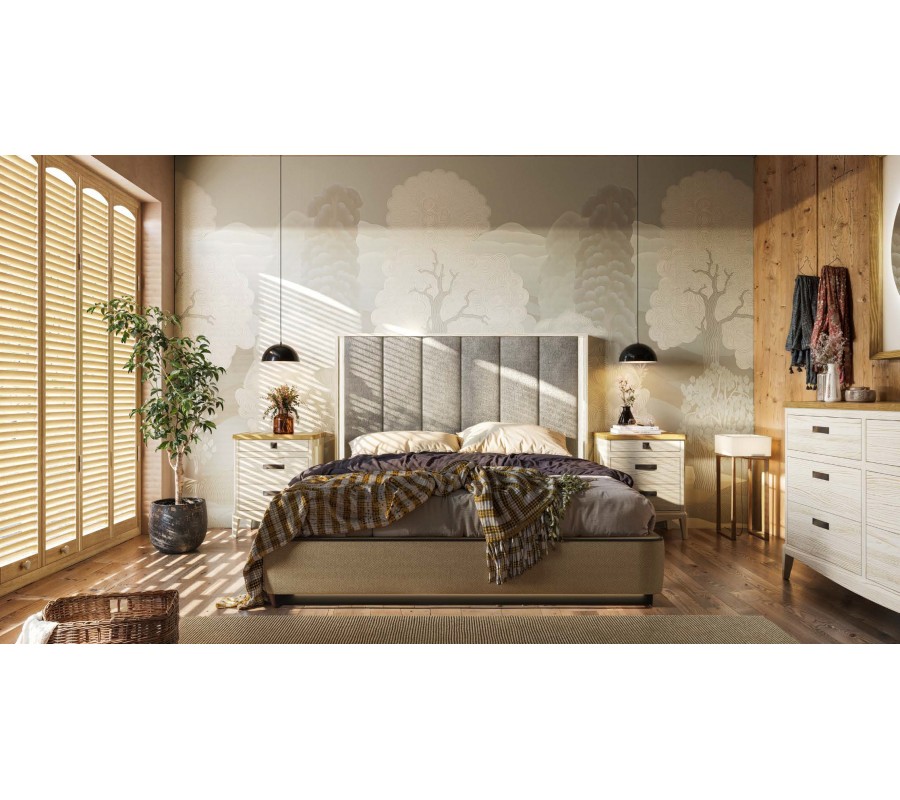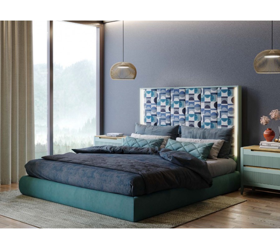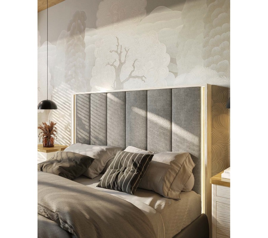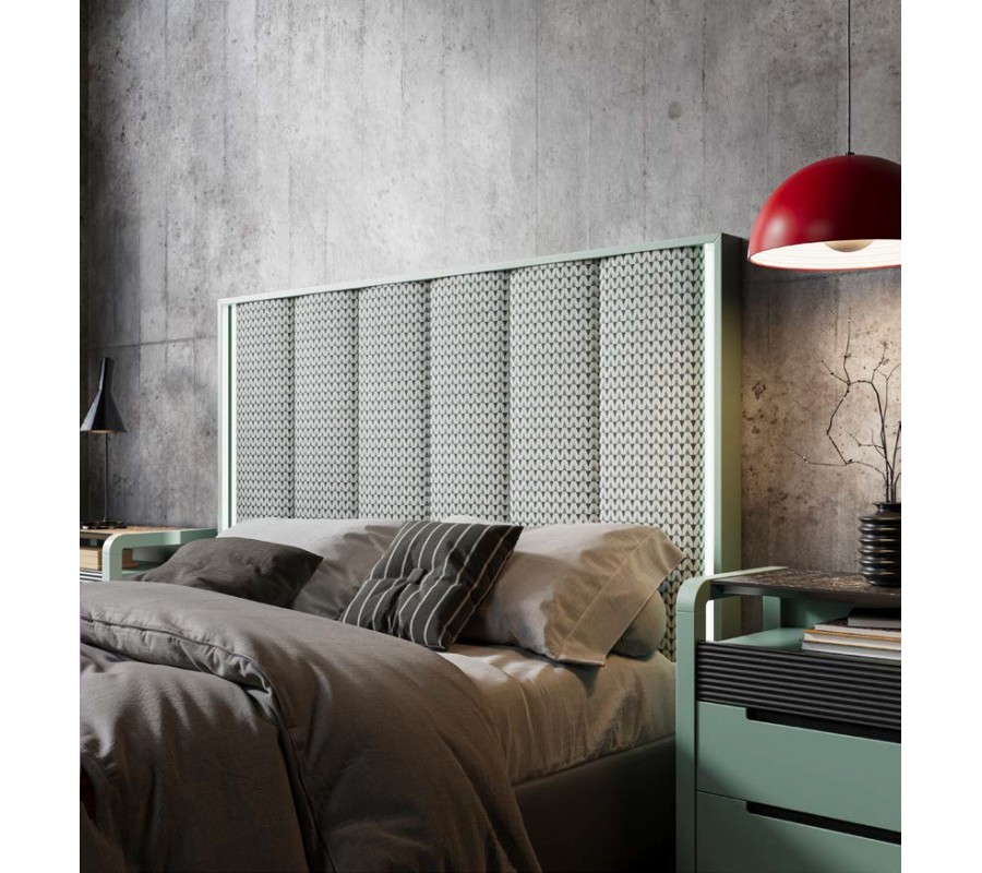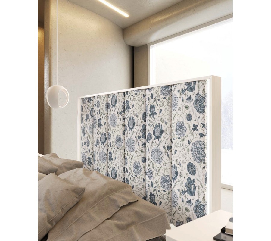 Dominantním prvkem postele je výrazné čelo s dřevěným rámem, do kterého je osazen čalouněný prošívaný panel. Tento detail dodává posteli reprezentativní charakter a zároveň zvyšuje komfort při opírání. Design čela působí nadčasově a umožňuje harmonické propojení s moderními i art deco interiéry.