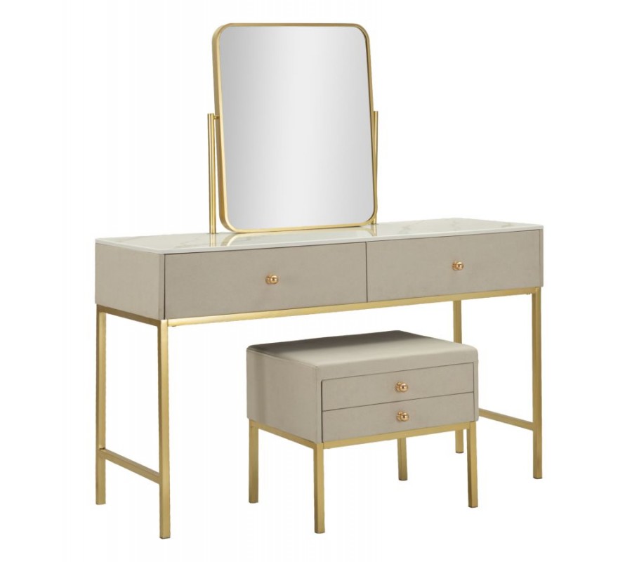 Sestavu tvoří toaletní stolek se zrcadlem a taburetka. Stolek má výšku 75 cm a obdélníkovou vrchní desku o rozměru 120x45 cm. Zdobí ji design bílého mramoru s jemným šedým žilkováním a pod ní jsou vedle sebe umístěny dvě zásuvky s kulatými kovovými úchyty.