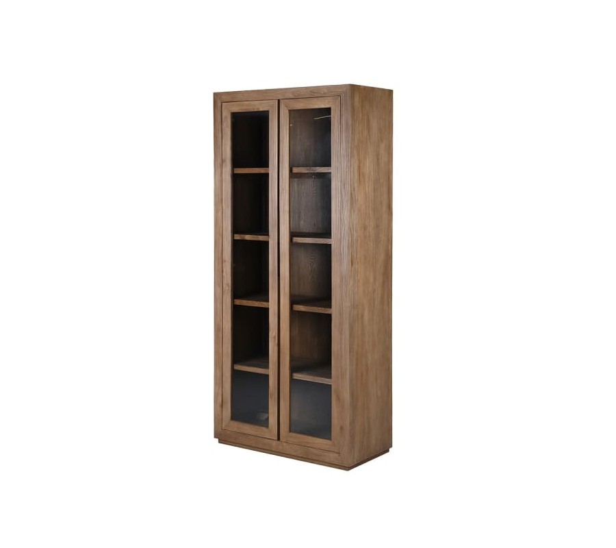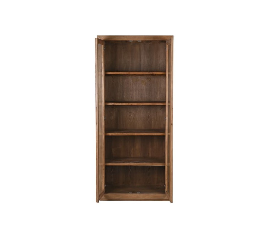 Knihovna má dvoudveřové prosklené provedení, které umožňuje přehledné uskladnění a zároveň stylové vystavení knih či dekorací. Dveře jsou řešeny minimalisticky – bez klasických úchytek, místo nich jsou na vnitřní straně vyříznuty praktické úchopy. Mezi dvířky zůstává úzký prostor, který dodává konstrukci optickou lehkost a usnadňuje otevírání.