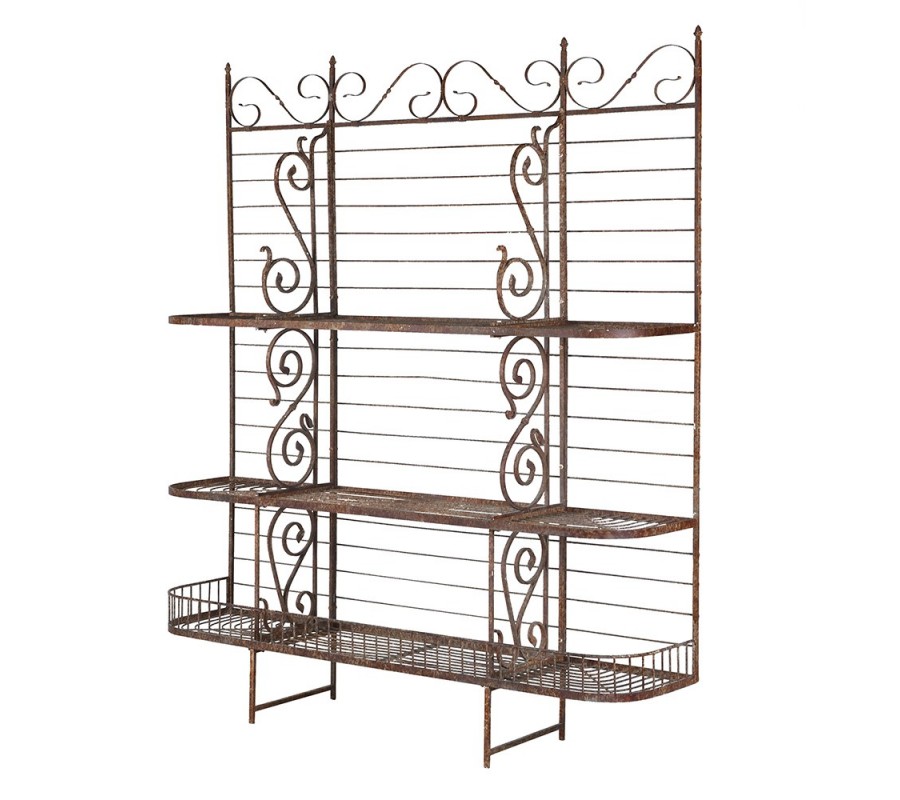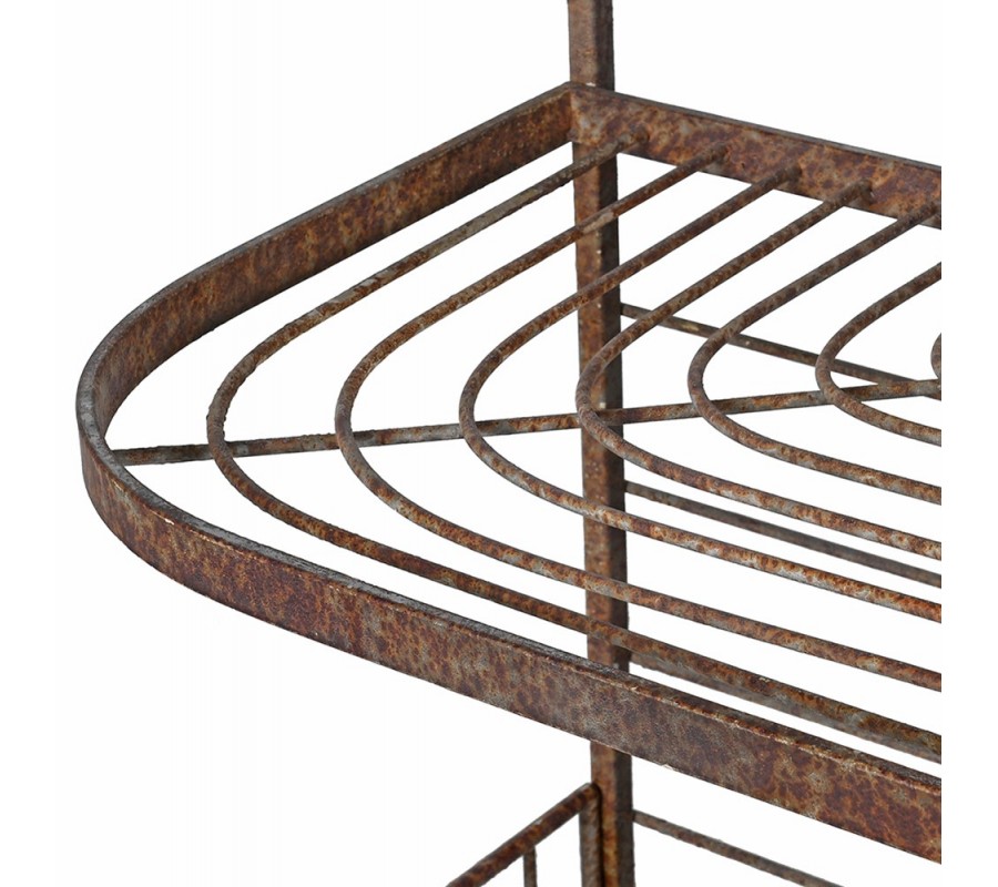 Luxusní vintage zahradní kovový regál Rustique se třemi poličkami a dekorativními spirálami s rezavým povrchem 235 cm