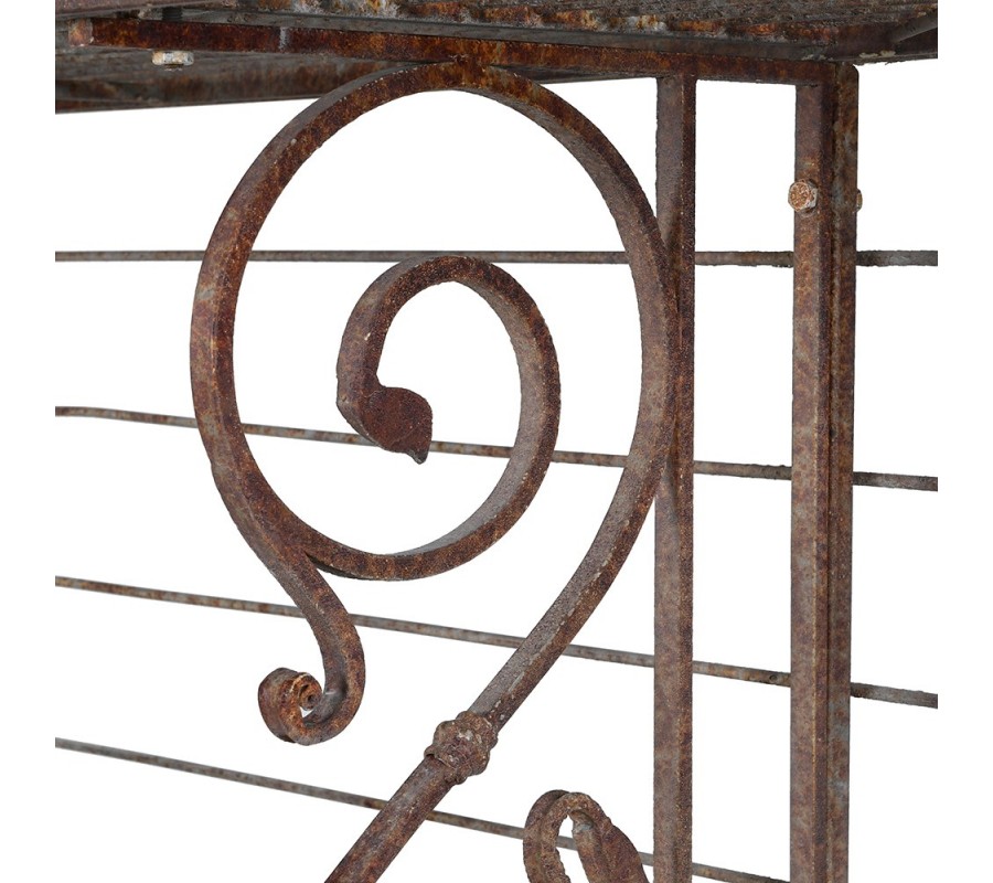 Luxusní vintage zahradní kovový regál Rustique představuje mistrovský kus nábytku, který spojuje umělecké zpracování kovu s autentickou rezavou patinou. Každý detail byl navržen tak, aby vyvolal pocit historické jedinečnosti a nadčasové elegance.