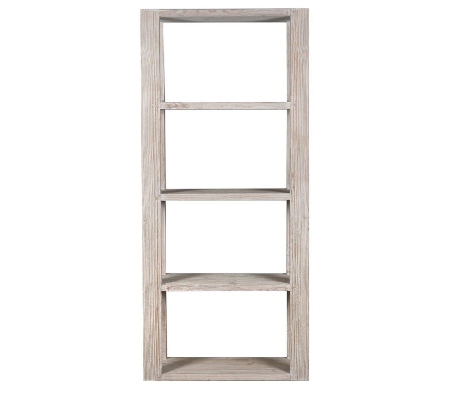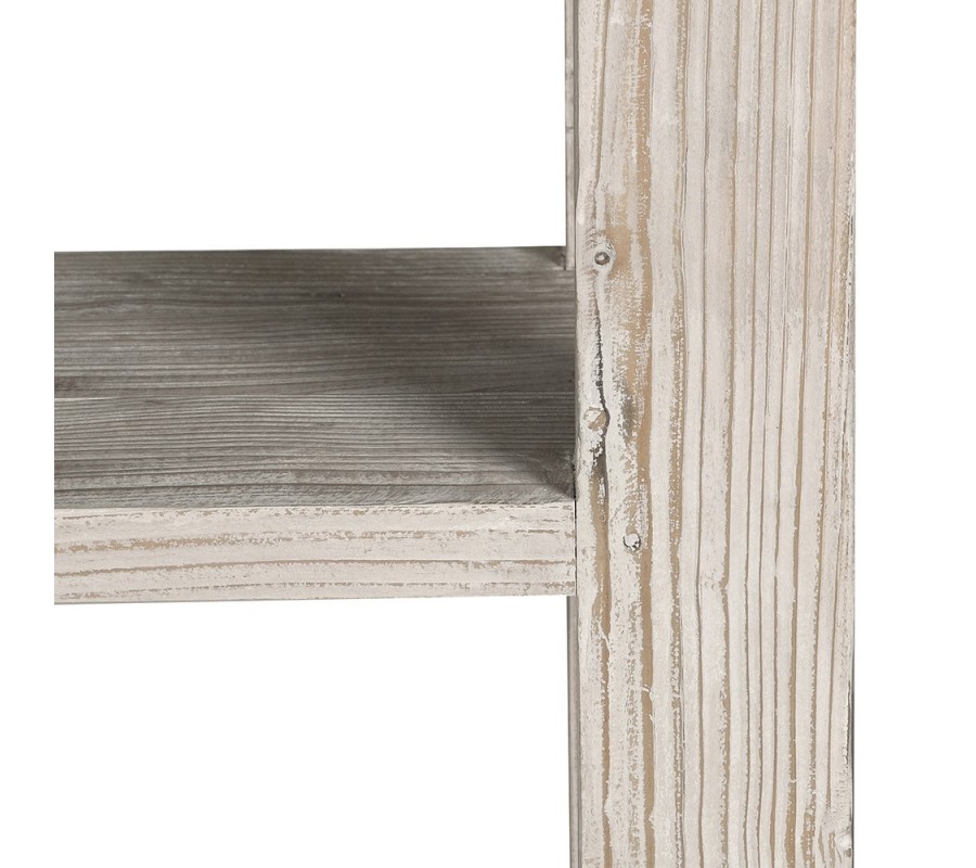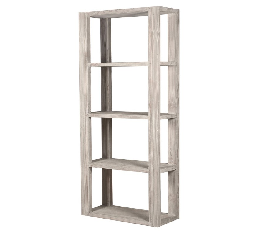 Regál je vyroben z recyklovaného masivního dřeva ve světlém krémovém lakování. Přes nátěr je přiznána naturální kresba letokruhů a jemné hnědé odstíny, které podtrhují přírodní charakter materiálu. Kromě toho je recyklované dřevo ekologické a jeho opětovné využití koresponduje s ideovým konceptem minimalismu, který klade důraz na funkčnost a praktičnost.