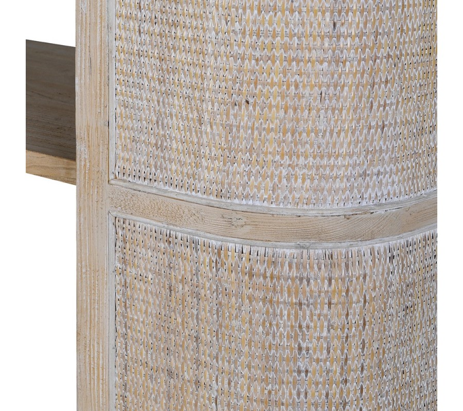 Luxusní venkovská knihovna Ratté Blanc zaujme už na první pohled jemně zaoblenými a plnými bočními stranami, které jí dodávají měkký, elegantní výraz. Konstrukce je vyrobena z masivního dřeva, přičemž boční panely jsou povrchově opleteny ratanem, což vytváří bohatou strukturu a přirozený řemeslný charakter. Vnější povrch má bílý, cíleně opotřebovaný vzhled, který podtrhuje vintage styl a dodává nábytku autentickou patinu.