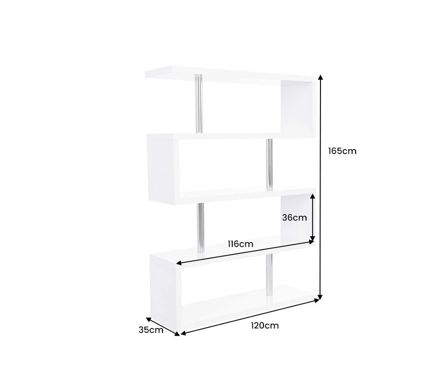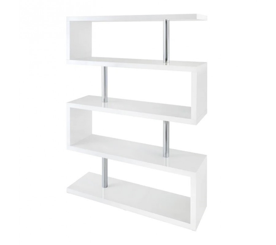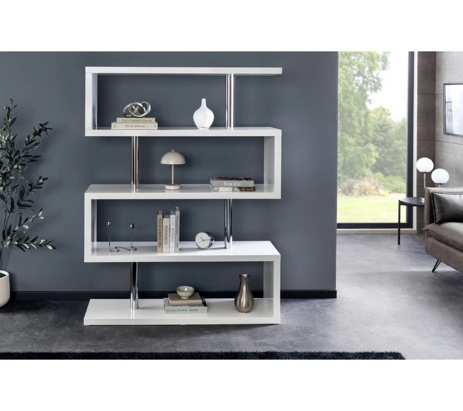 Moderní bílý lesklý regál Culebra se čtyřmi policemi s asymetrickým propojením a lesklými chromovými detaily 165 cm