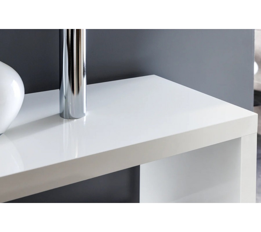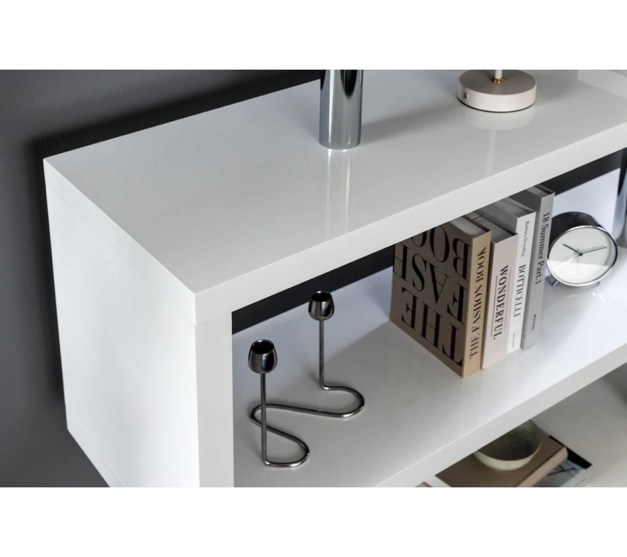 Regál je vyroben z kvalitní dýhy s lesklou bílou povrchovou úpravou. Moderní vizuál dotváří chromové provedení kovových částí. Reflexní povrchy a světlá barva působí odlehčeným a vzdušným dojmem, který podtrhuje i otevřená přední a zadní strana. Regál je tak můžete postavit ke stěně či umístit volně do prostoru v roli předělovače.