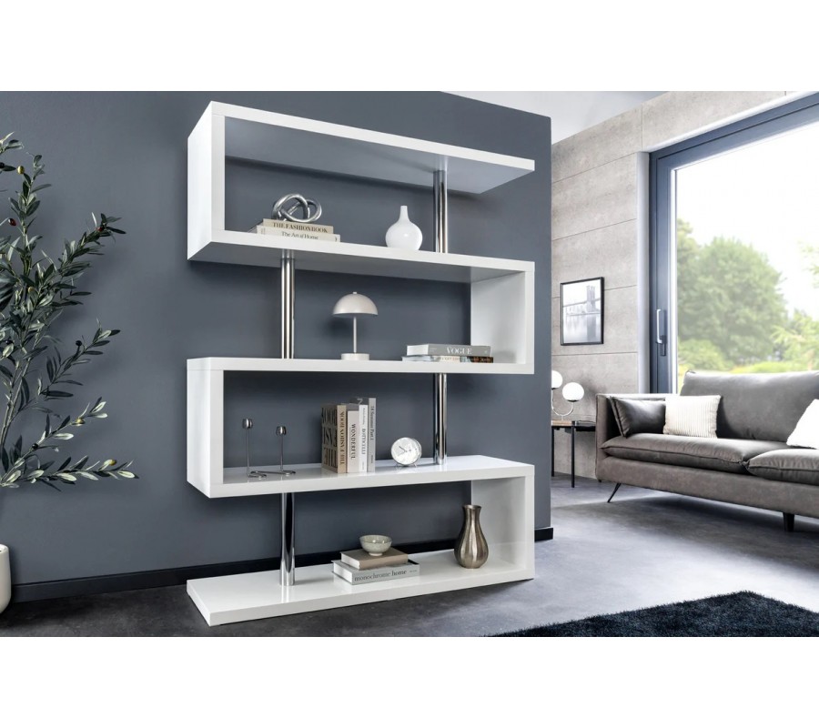 Moderní bílý lesklý regál Culebra se čtyřmi policemi s asymetrickým propojením a lesklými chromovými detaily 165 cm