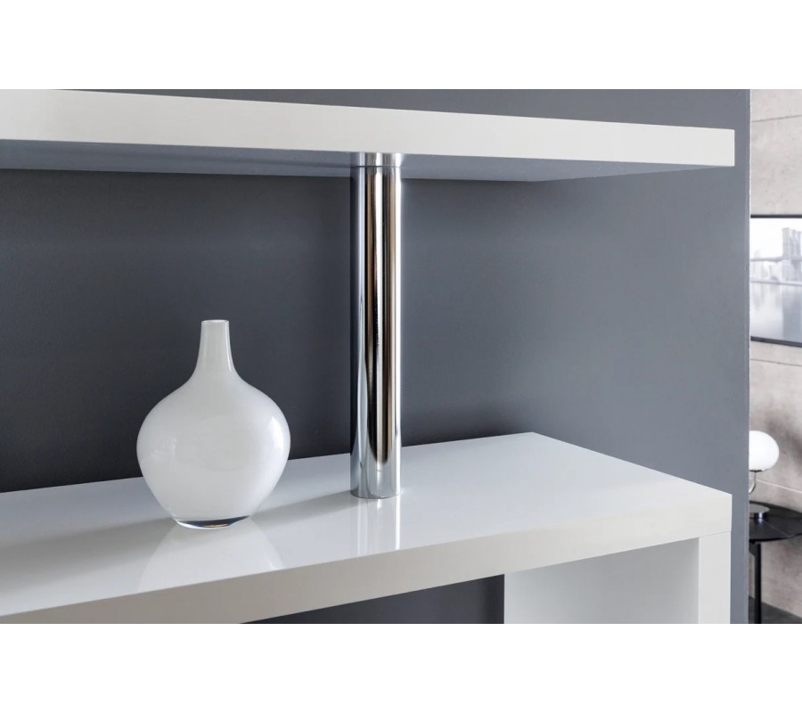 Regál je vyroben z kvalitní dýhy s lesklou bílou povrchovou úpravou. Moderní vizuál dotváří chromové provedení kovových částí. Reflexní povrchy a světlá barva působí odlehčeným a vzdušným dojmem, který podtrhuje i otevřená přední a zadní strana. Regál je tak můžete postavit ke stěně či umístit volně do prostoru v roli předělovače.