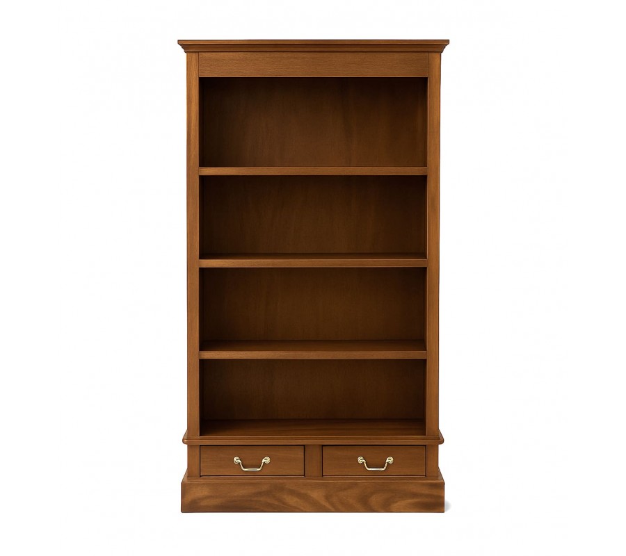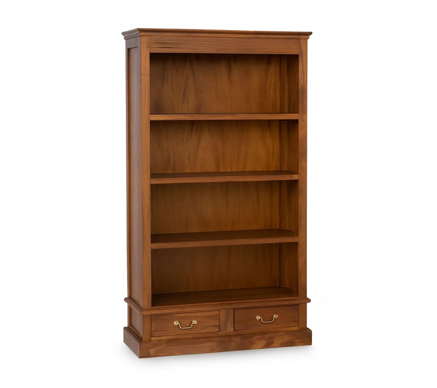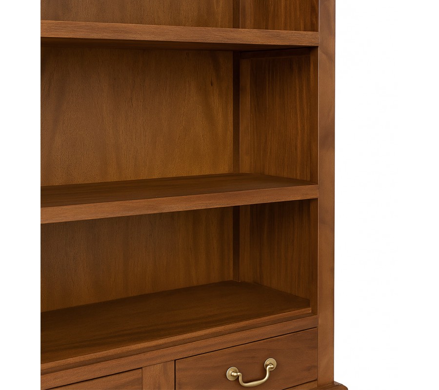 Luxusní koloniální mahagonová knihovna Donelly v hnědé barvě se čtyřmi policemi a dvěma šuplíky se zlatou úchytkou 180 cm