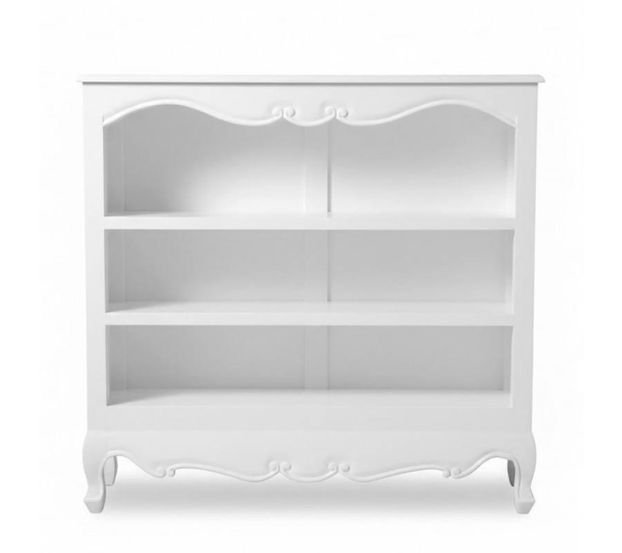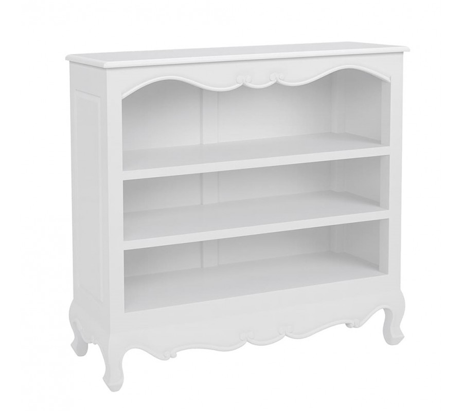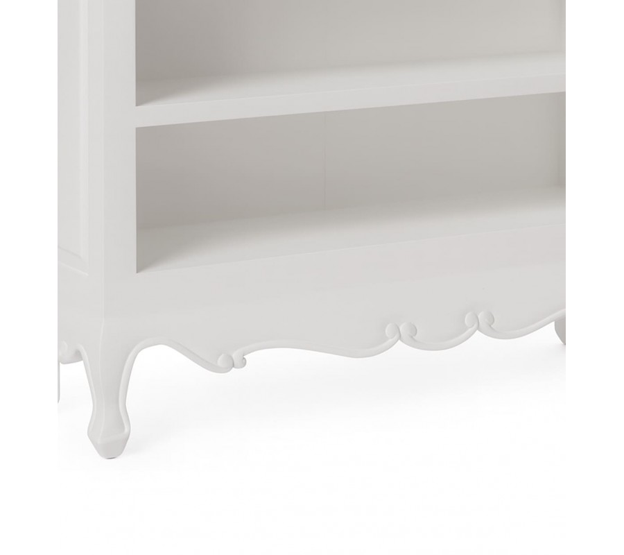 Luxusní provensálská nízká knihovna Mahani se třemi policemi a vyřezávaným zdobením v bílé barvě 110 cm