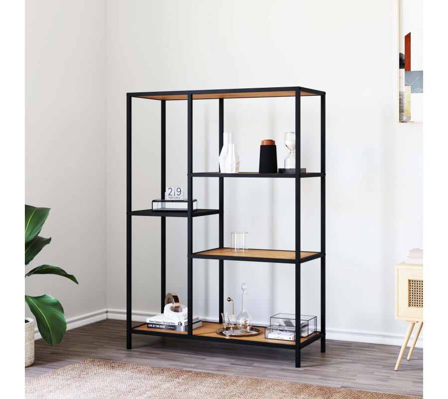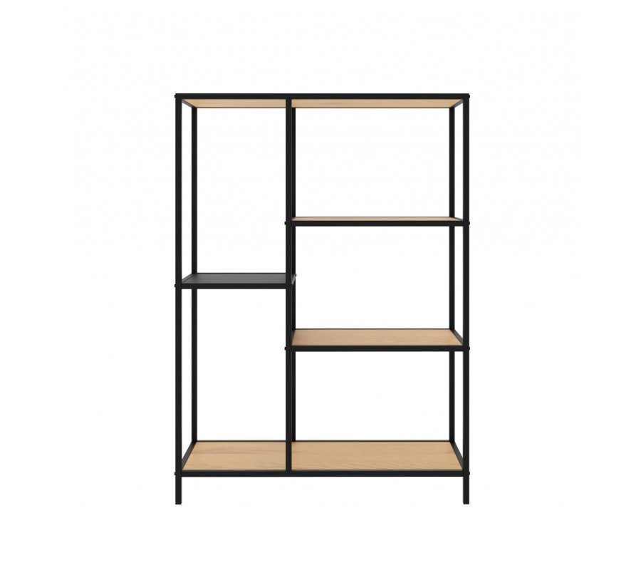 Knihovna má čtyři police, které jsou uspořádány v otevřené konstrukci s asymetrickým rozdělením. Police se střídají v různých výškách a šířkách, čímž vzniká dynamická kompozice vhodná pro uložení knih, dekorací, rostlin či úložných boxů. Toto řešení zároveň rozbíjí pravidelnost klasické knihovny a dodává nábytku moderní vizuální charakter.