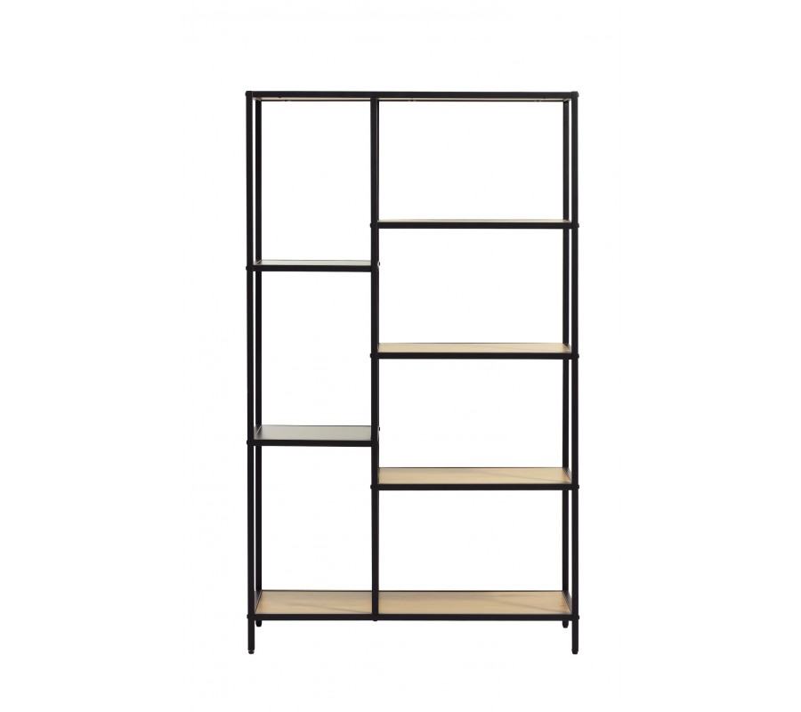 Knihovna obsahuje šest otevřených polic, které jsou rozmístěny v asymetrické kompozici. Na levé straně se nacházejí dvě menší čtvercové police umístěné nad sebou, zatímco na pravé straně jsou tři obdélníkové police v různých výškách. Zcela spodní část tvoří ještě jedna široká obdélníková police, která propojuje celou konstrukci a poskytuje největší úložný prostor. Střídání velikostí a poloh polic vytváří dynamický vizuální rytmus a zároveň umožňuje kombinovat knihy, dekorace, rostliny či úložné boxy.